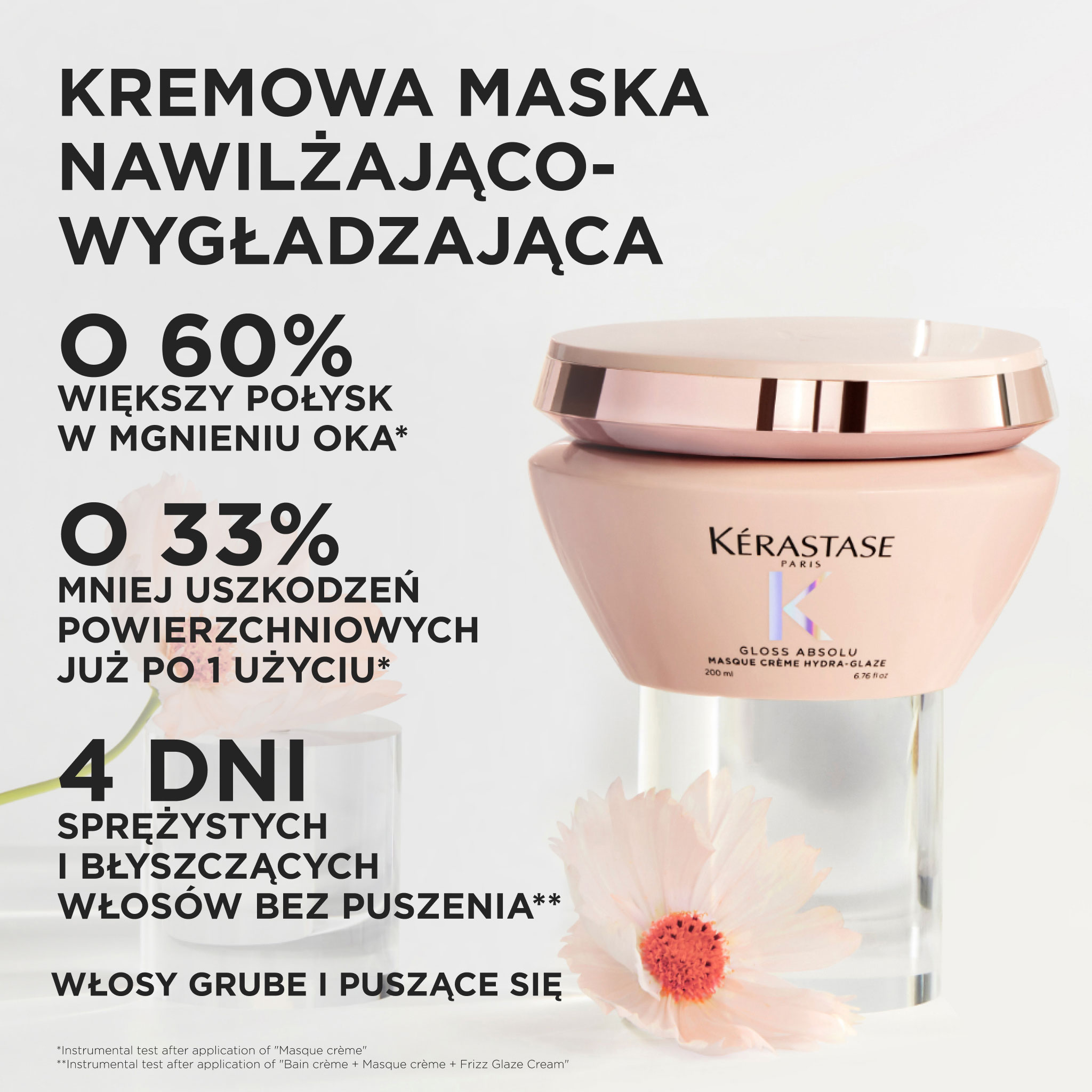 Maska wzbogacona Gloss Absolu Créme Hydra-Glaze to kremowa maska nawilżająco-wygładzająca od Kérastase, przeznaczona do włosów grubych, puszących się, wymagających natychmiastowego wygładzenia. Formuła z kwasem hialuronowym, glikolowym i olejkiem z dzikiej róży odżywia warstwy włosów i zapewnia intensywną ochronę przed puszeniem.