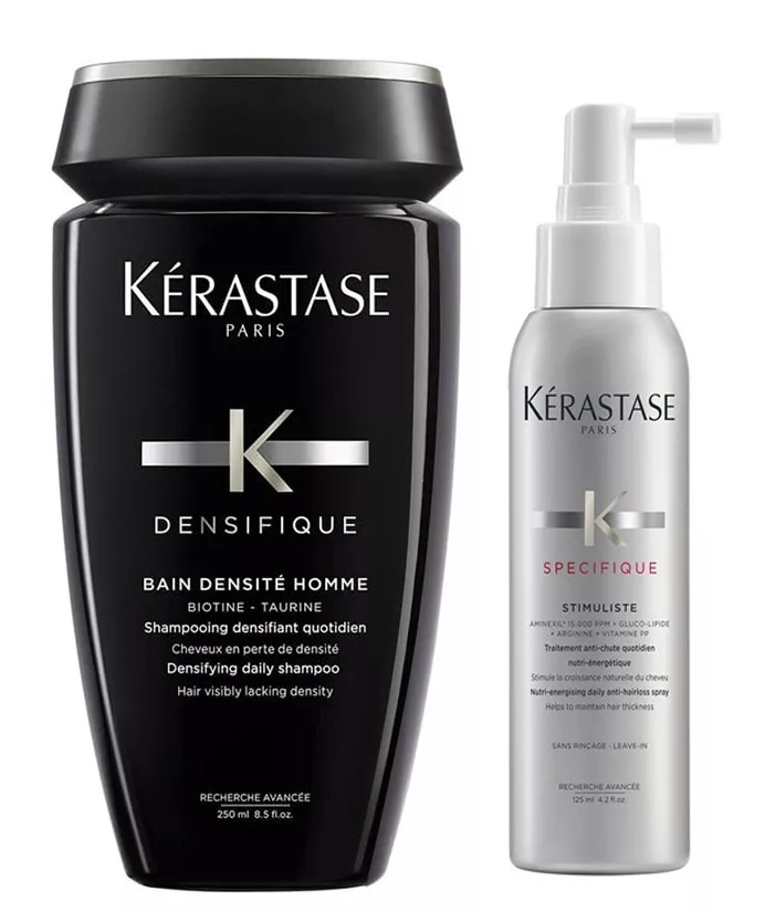 Zapomnij o problemie utraty gęstości włosów. Odpowiednie kosmetyki przywrócą włosom grubość i gęstość, a także zadziałają stymulująco na skórę głowy. Sięgnij po zestaw dla mężczyzn Kerastase Densifique ze sprayem pobudzającym porost włosów. Działanie kąpieli zagęszczającej Kerastase Densifique opiera się na technologii Biotyna i polimerach teksturyzujących. Kosmetyk ten wzmacnia włosy oraz chroni je przed dalszym wypadaniem. Włosy są widocznie zagęszczone i jest ich optycznie więcej. Spray pobudzający wzrost włosów Kerastase Specifique Stimuliste Aminexil wspomaga stymulację włókna włosowego, nie dopuszcza do utraty gęstości włosów i wzmacnia ich korzeń.