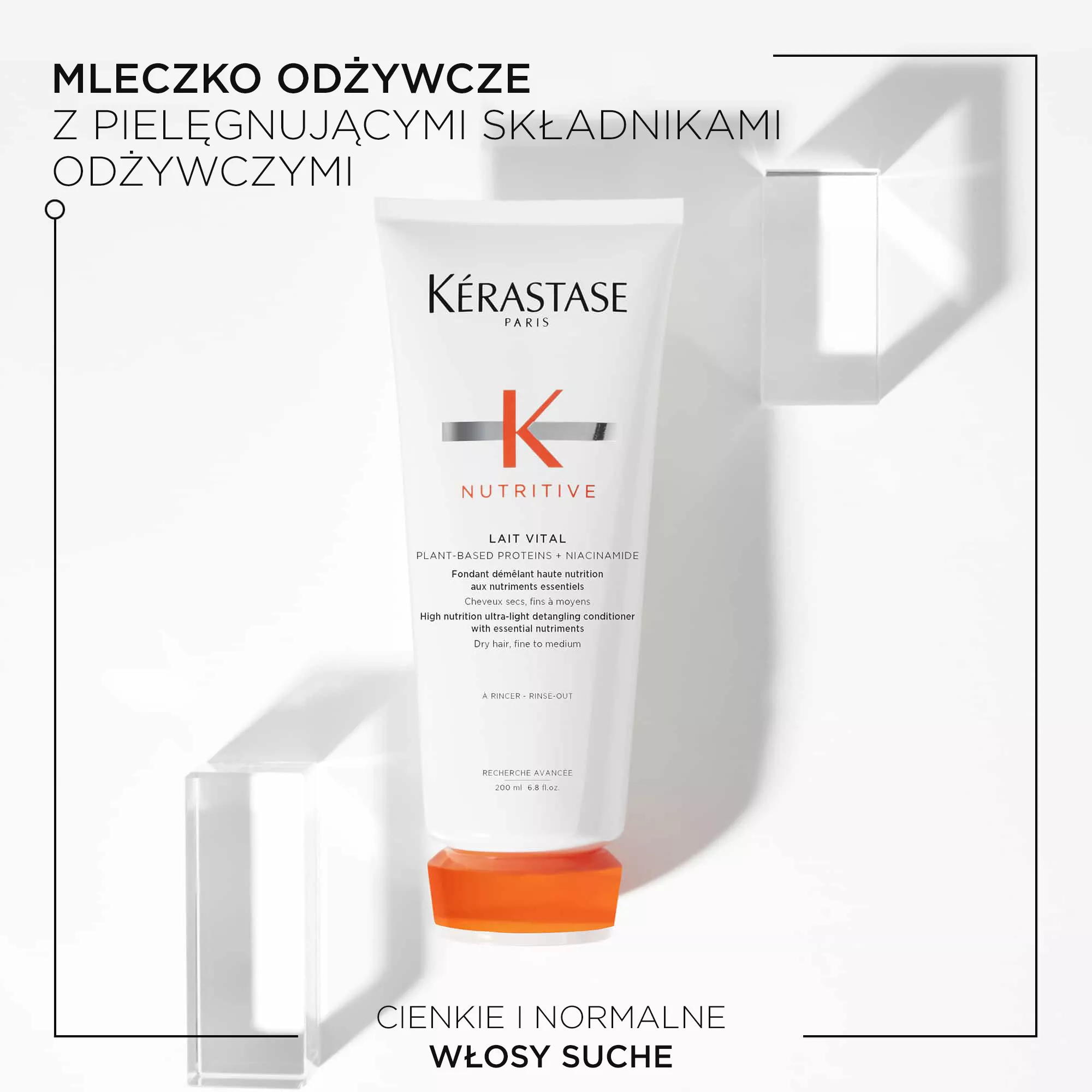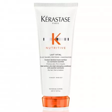 Mleczko odżywcze Kerastase Nutritive Lait Vital przeznaczone jest do pielęgnacji włosów lekko suchych i normalnych. To silnie działająca ultralekka ułatwiająca rozczesywanie odżywka do cienkich i normalnychwłosów suchych. Zawiera odżywcze lipidy i witaminy, które intensywnie odżywiają włosy suche, wygładzając je i ułatwiając ich rozczesywanie. Odżywka Lait Vital jest bogata w niezbędne składniki odżywcze, dzięki którym formuła doskonale odżywia i wzmacnia włosy. Lekka, kremowo-żelowa formuła szybko wnika we włosy i przynosi efekt natychmiastowego nawilżenia i odżywienia. Opakowanie wykonano w 45% z tworzywa z recyclingu.