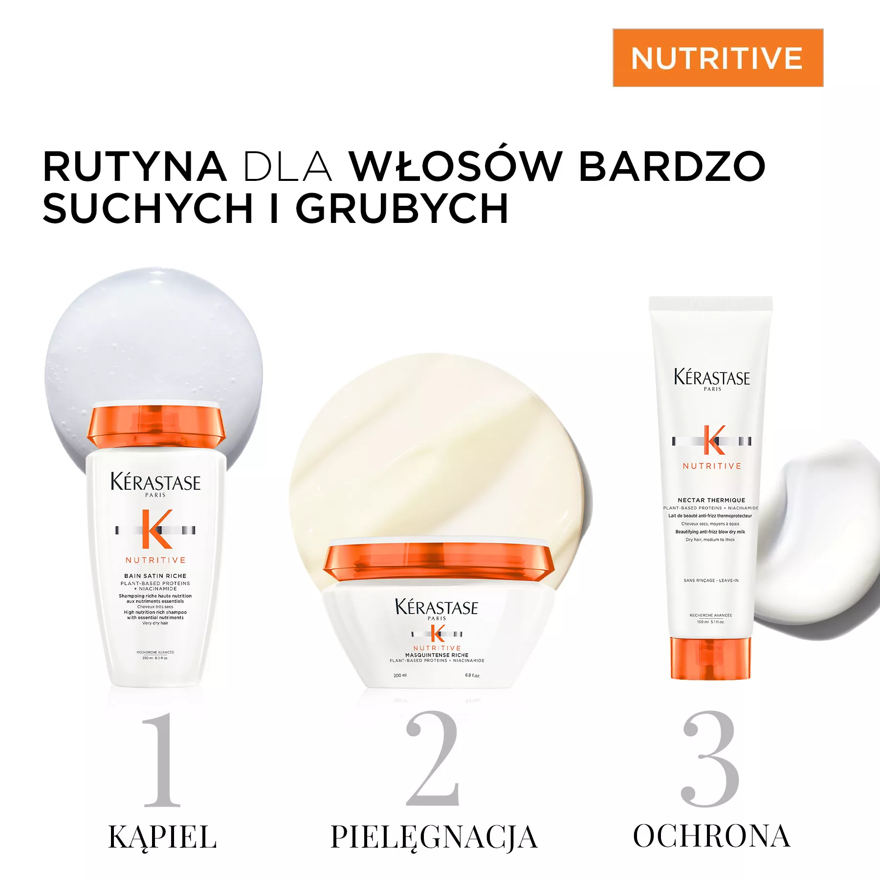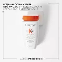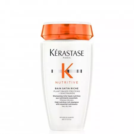 Kąpiel Kerastase Nutritive Satin Riche przeznaczona jest do pielęgnacji włosów bardzo suchych. Doskonale oczyszcza włosy i przygotowuje je do dalszej pielęgnacji. W efekcie włosy są miękkie, odżywione i wzmocnione. Szampon Zawiera polimery zapobiegające przesuszaniu, które zapewniają intensywne odżywienie i wzmacniają włosy, dzięki czemu jest jednym z najlepszych szamponów do włosów bardzo suchych. Dodatkowo, zawiera niezbędne składniki odżywcze, które odżywiają i wzmacniają włosy suche bez ich obciążania. Kąpiel Kerastase Nutritive Satin Riche ma formę kremowego żelu. Nie wymaga tarcia włosów, dzięki czemu polecana jest do swędzącej skóry głowy.