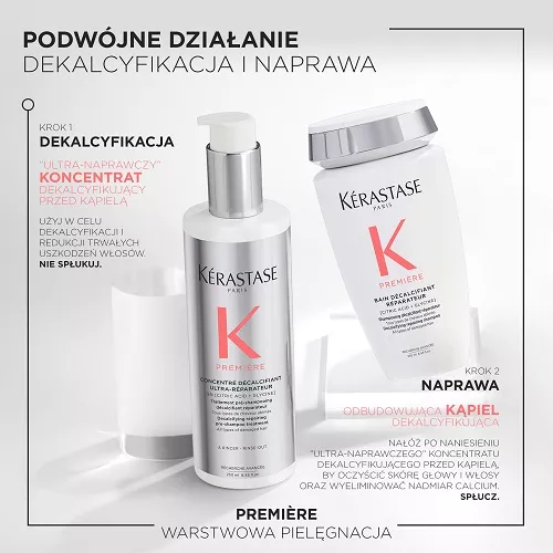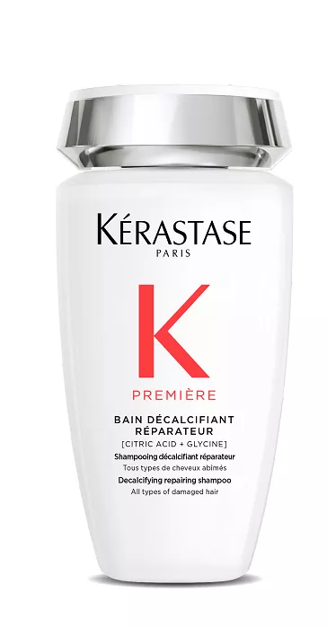 Odbudowująca kąpiel dekalcyfikująca Première od Kérastase to chelatujący szampon regenerujący do włosów zniszczonych. Szampon o bogatej formule i podwójnym działaniu, usuwający calcium (wapń) oraz wzmacniający i regenerujący zniszczone włosy. Działa we wnętrzu i na powierzchni włosa. Szampon ma białą, kremową konsystencję oraz obficie się pieni. Pozbądź się niszczącego włosy calcium dzięki temu profesjonalnemu szamponowi od Kérastase, który łagodnie oczyszcza włosy i skórę głowy. Regeneruje włosy od wewnątrz, zmniejsza ich łamliwość i przywraca im zdrowy wygląd i połysk.