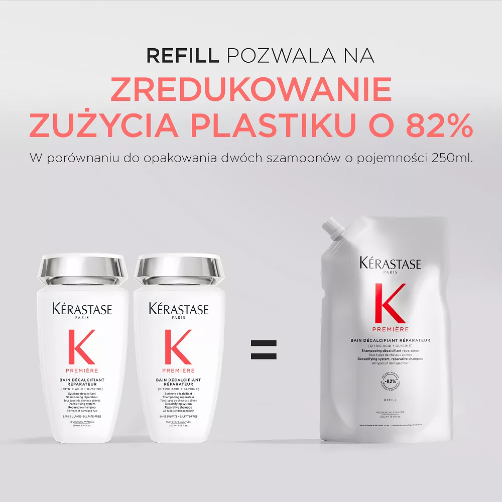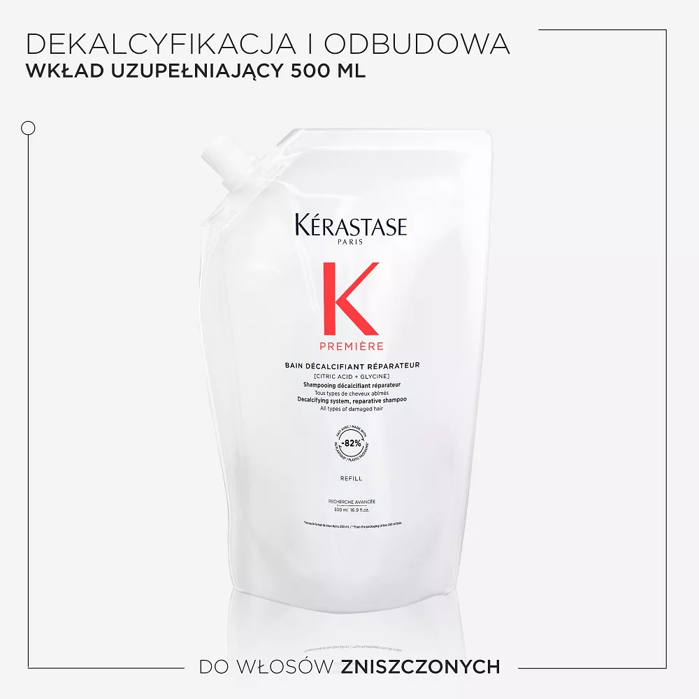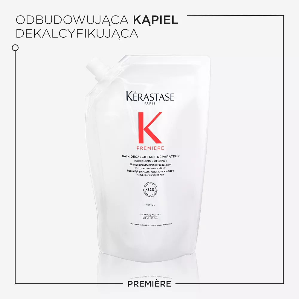Zalecamy, aby przed nałożeniem warstwy Odbudowującej Kąpieli dekalcyfikującej Kérastase Première nałożyć na mokre włosy najpierw warstwę ""Ultra-naprawczego"" Koncentratu dekalcyfikującego Kérastase Première, a następnie warstwę Odbudowującej Kąpieli dekalcyfikującej Kérastase Première i nie spłukiwać ich w celu osiągnięcia najlepszych rezultatów. Szampon można łączyć również z innymi produktami z gamy Première, jak np. z Odbudowująco Regenerującą Maską dla zapewnienia dodatkowego działania naprawczego i odbudowującego.