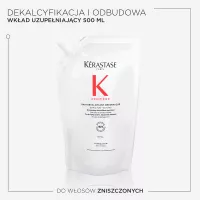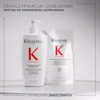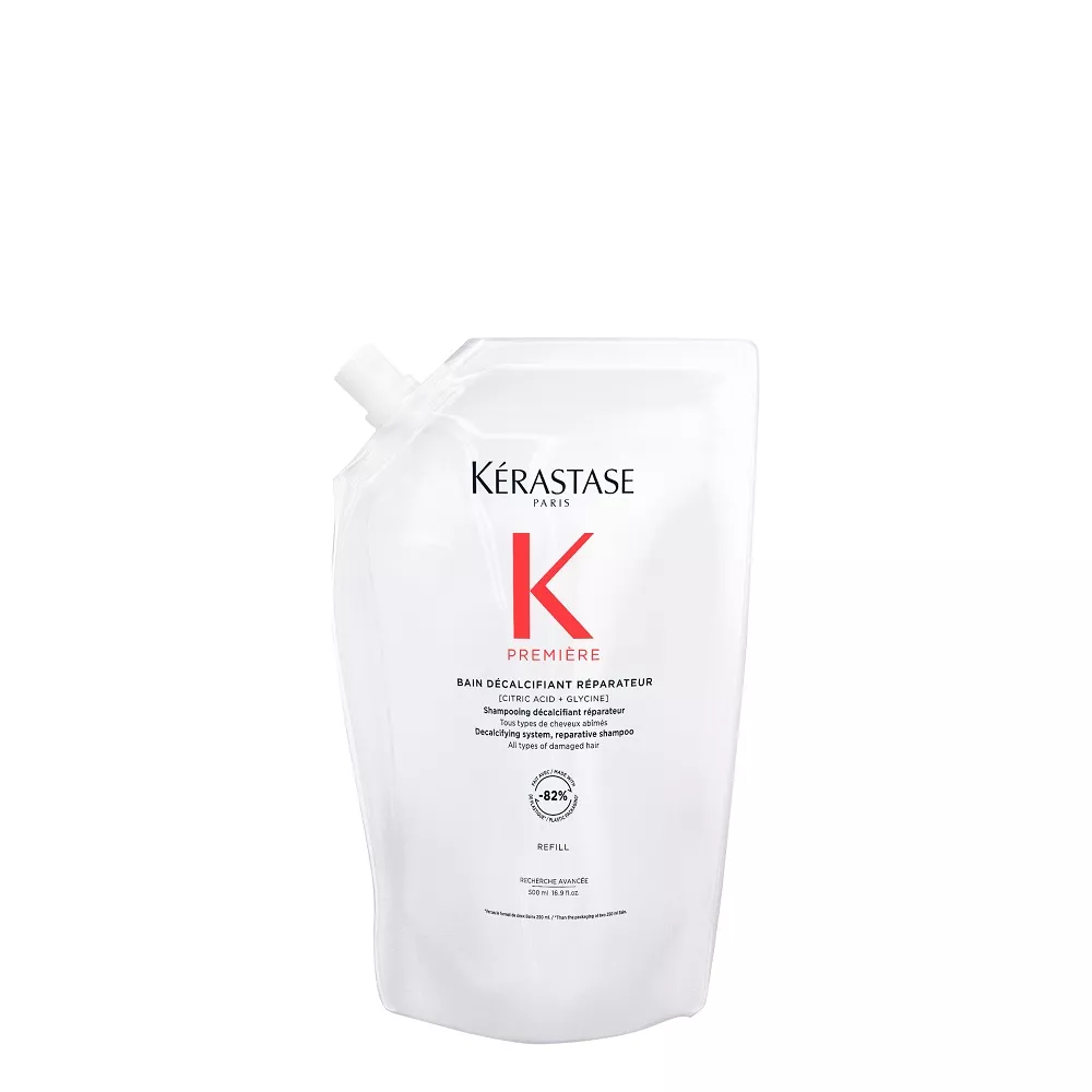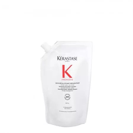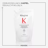 Odbudowująca Kąpiel dekalcyfikująca Kérastase Première to dekalcyfikujący szampon naprawczy do wszystkich typów włosów osłabionych zabiegami chemicznymi oraz zniszczonych. Ten szampon do użytku profesjonalnego delikatnie oczyszcza skórę głowy i włosy usuwając wapń, które osłabia włosy zniszczone. Naprawia włosy od wewnątrz, redukuje ich łamliwość i przywraca zdrowy wygląd. Biały, kremowy szampon, który zmienia się w luksusową piankę ma podwójne działanie: eliminuje nadmiar wapnia z twardej wody, który uszkadza osłabione już bądź rozjaśniane włosy i sprawia, że są one matowe, bez życia i wiotkie. Przywraca również połączenia keratynowe w trzonie włosa, naprawiając włosy. Włosy stają się gładkie i łatwe w układaniu, lśniące i sprężyste.