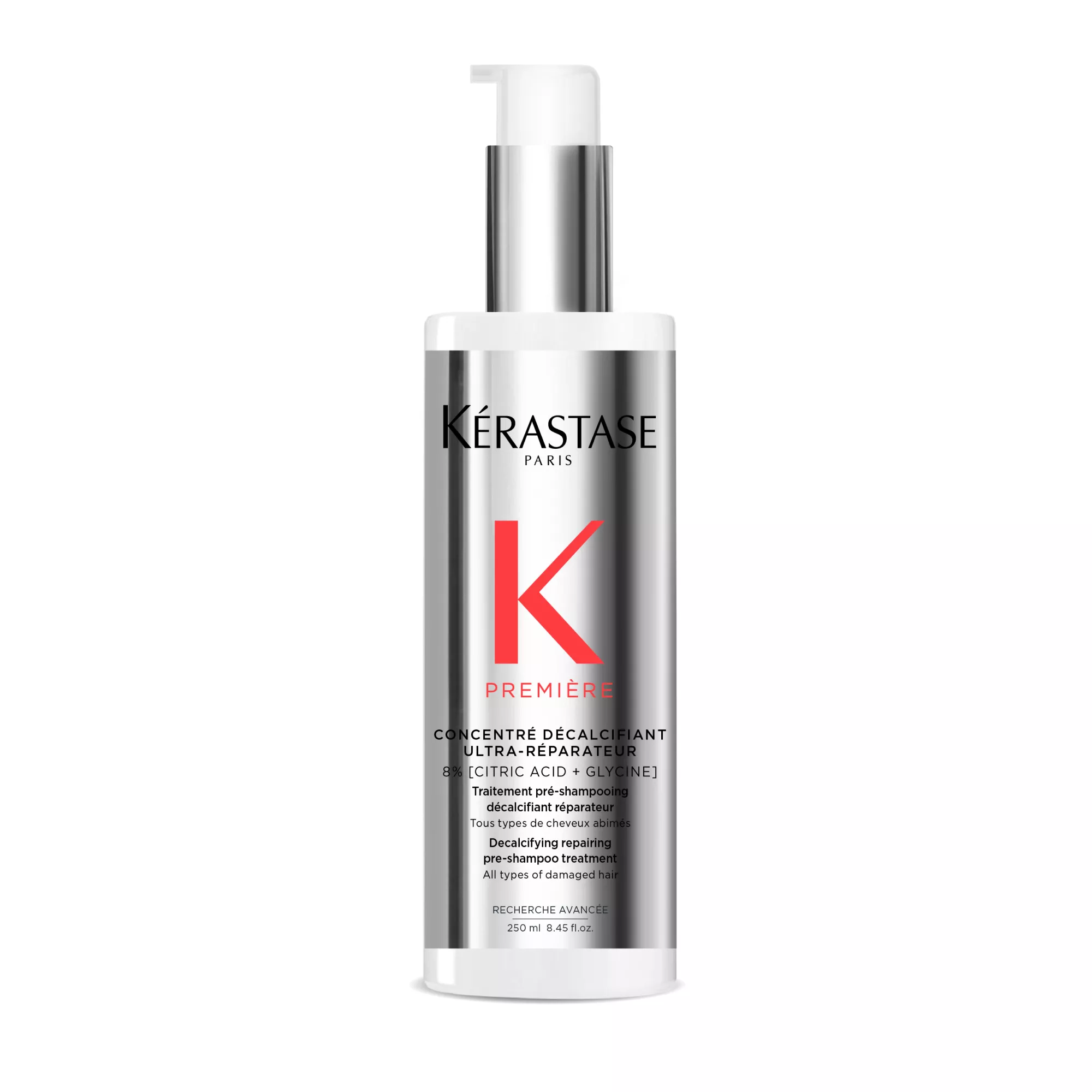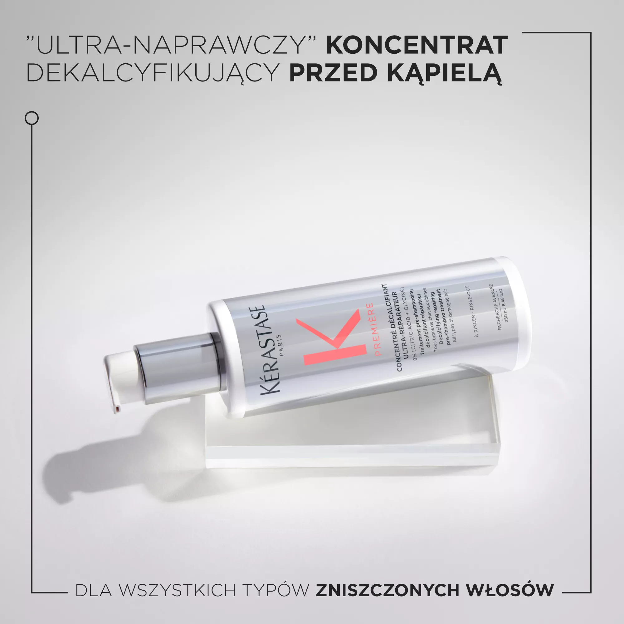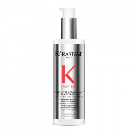 Ultra-naprawczy" koncentrat dekalcyfikujący przed kąpielą Première od Kérastase to pielęgnacja przed użyciem szamponu o podwójnym działaniu chelatującym i regenerującym włosy zniszczone. Oczyszcza z clacium (wapnia) i wzmacnia włosy, które stają się mocniejsze, gładsze i bardziej lśniące. Produkt ma konsystencję przezroczystego żelu.