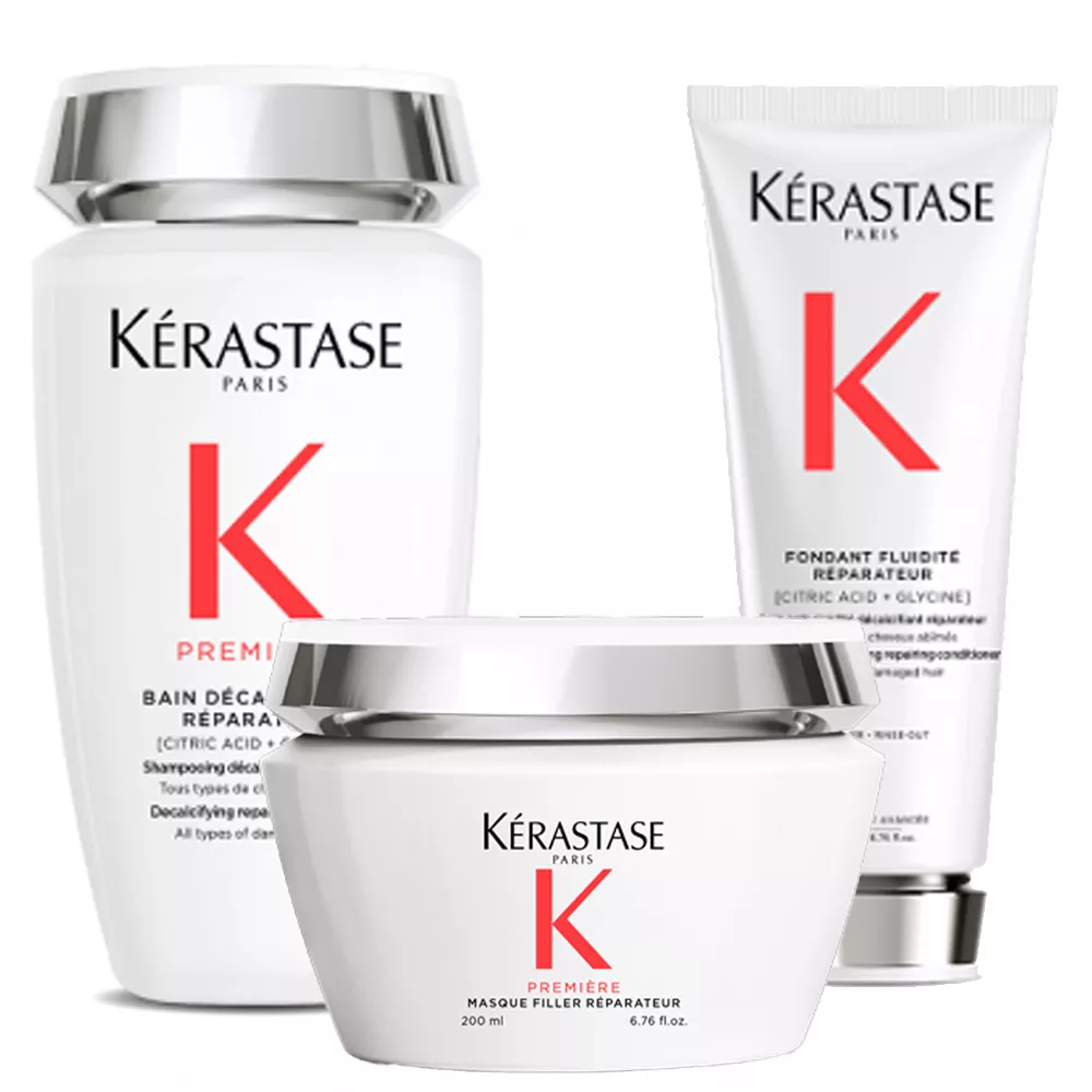 Naprawcza kąpiel dekalcyfikująca Première to chelatujący szampon regenerujący do każdego rodzaju włosów nadmiernie obciążonych zabiegami lub włosów zniszczonych. Ten profesjonalny szampon łagodnie oczyszcza skórę głowy i włosy, jednocześnie usuwając calcium, które jeszcze bardziej osłabia włosy. Regeneruje włosy od wewnątrz, zmniejsza ich łamliwość i przywraca zdrowy wygląd. Pierwsza odżywka chelatująco-regenerująca od Kérastase do każdego typu włosów zniszczonych. Przywraca włosom elastyczność, wzmacniając ich włókna. Natychmiast przywraca nawilżenie i płynność włosom nadmiernie obciążonym zabiegami lub włosom rozjaśnianym.