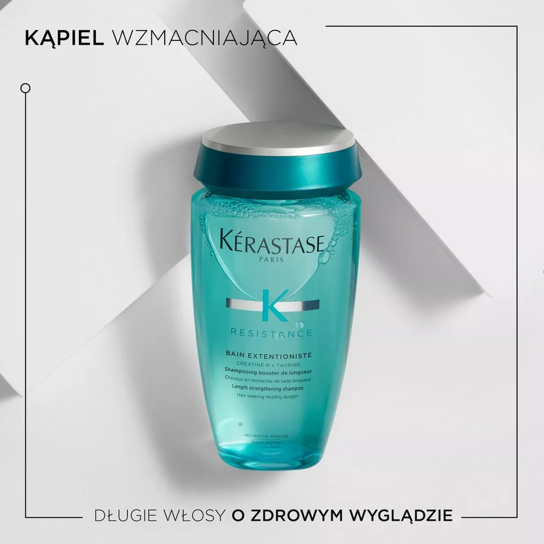 Marka Kerastase przygotowała kompletny program, dzięki któremu Twoje marzenie o długich włosach w końcu będzie mogło się spełnić. Seria kosmetyków Kerastase Resistance Extentioniste wzmacnia włosy, redukuje problem rozdwojonych końcówek i niweluje łamliwość pasm. Kąpiel wzmacniająca włosy Kerastase Resistance Extentioniste widocznie wzmacnia włókna włosów - bez obciążania. W efekcie pasma nie łamią się nadmiernie, są miękkie i łatwiej je rozczesać. Szampon swoją skuteczność opiera na taurynie (aminokwas, który chroni włosy) i kompleksie Creatine R. Jest to połączenie keratyny i ceramidów. Taki duet idealnie wzmacnia włosy i sprawia, że wyglądają bardzo atrakcyjnie. Kąpiel jest łatwa i przyjemna w użyciu. Szampon jest przezroczysty.