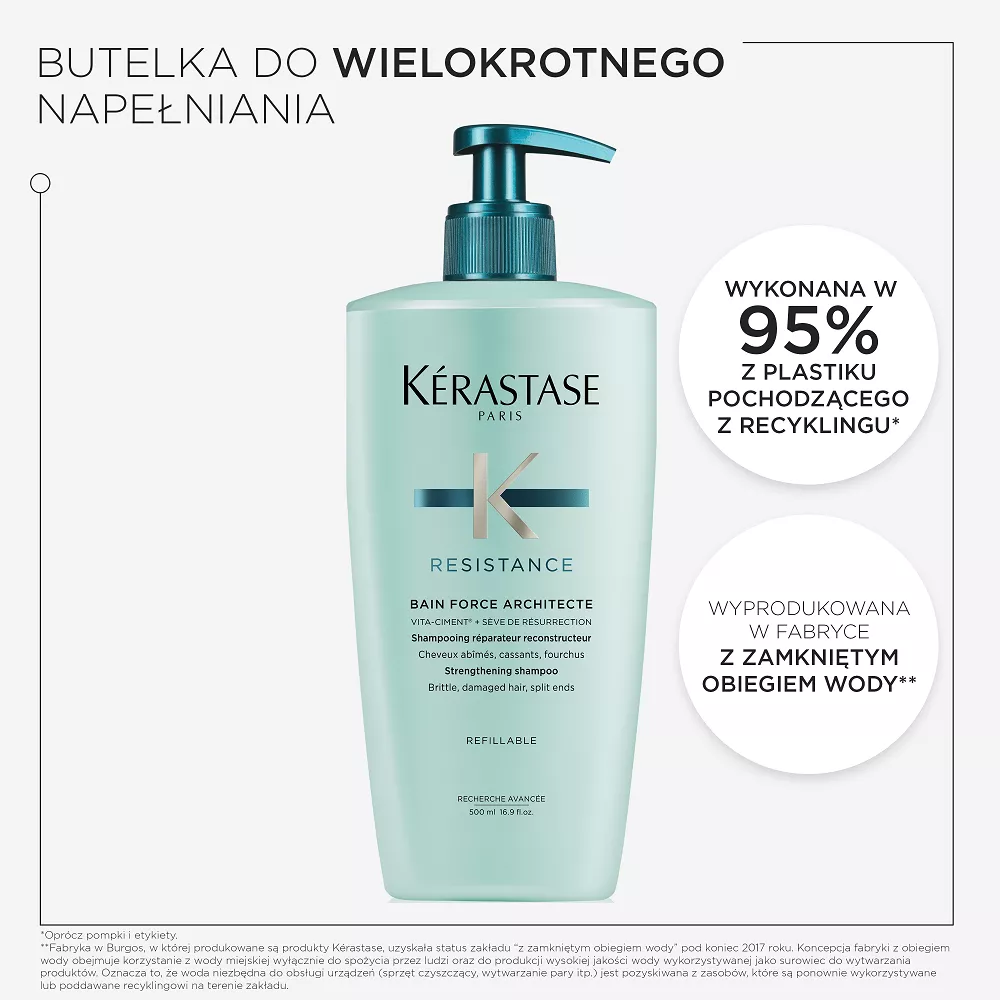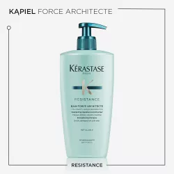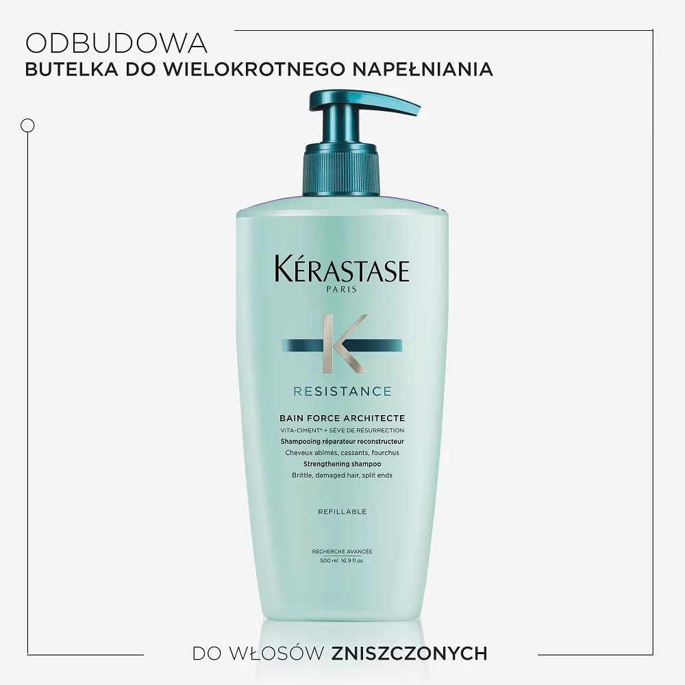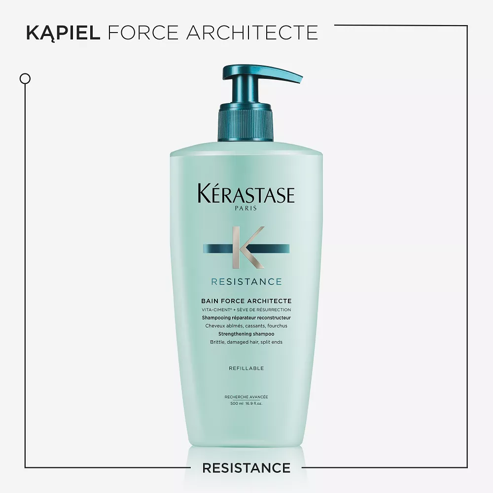 Ten profesjonalny szampon do włosów Kerastase Force Architecte powstał z myślą o włosach wyraźnie osłabionych i ekstremalnie zniszczonych. Łamliwe i kruche włosy nie wyglądają pięknie. Trzeba im zatem zapewnić odpowiednią odbudowę. Dzięki obecności aktywnych składników takich jak: ceramidy, naturalne proteiny i aktywne kationy Twoje włosy odzyskają zdrowy wygląd. Kosmetyk posiada unikalny kompleks Vita Ciment, jego działanie polega na tym, że wnika głęboko w strukturę włosa i uzupełnia ubytki naturalnego cementu międzykomórkowego. Natomiast kompleks Vita Top Seal jest odpowiedzialny odtworzenie wierzchniej warstwy włosów. W rezultacie Twoje włosy są mocne, błyszczące i zdrowe.