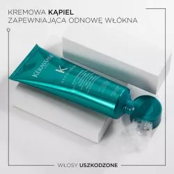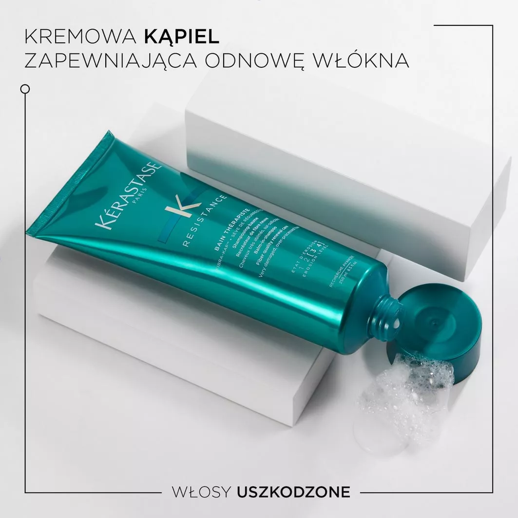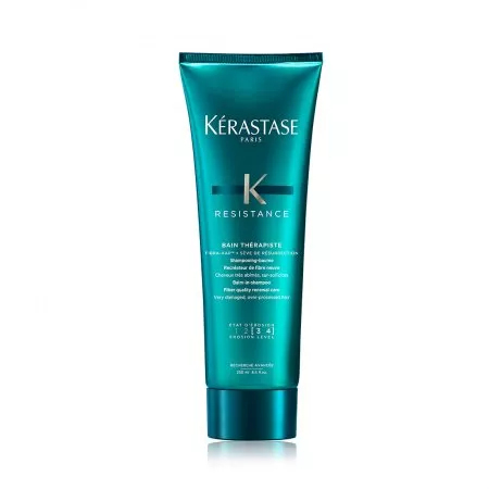 Produkt ten powstał z myślą o włosach bardzo zniszczonych i osłabionych. Kąpiel Kerastase Resistance Therapiste to pierwszy balsam o unikalnej żelowej konsystencji, który otula włókno włosa w trakcie kąpieli, ograniczając tarcie. Produkt ten swoją skuteczność opiera na systemie FIBRA-KAP. Kapy są to białka współwystępujące z keratyną i stanowią 50% włókna włosa. Są to mikroproteiny łączące i wiążące ze sobą keratynę. Ogrywają one bardzo ważną rolę. Pierwsze włosy zawierają duże ilość KAPów natomiast w zniszczonych zanikają. Wtedy struktura włosa rozpada się. Dlatego też KAPy są niezbędne i zapewniają spójność włókna włosa. System FIBRA-KAP zastępuje brakujące KAPy i reaktywuje ich syntezę. Ponadto zawiera aż 6 aminokwasów, hydrolat białka pszenicy i ekstrakt z rośliny rezurekcyjnej, który ma właściwości regenerujące.