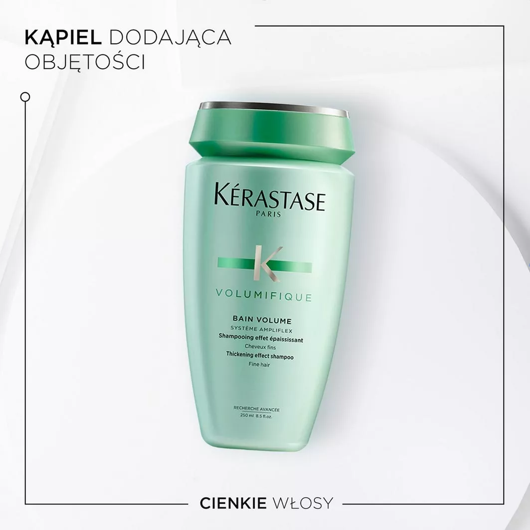Produkt ten skierowany jest do pielęgnacji włosów osłabionych, bez objętości i witalności. Jeśli mało w nich życia, a puszystość to czyste wspomnienie. Kąpiel Kerastase Volumifique dodaje objętości włosom cienkim. Kosmetyk ten sprawi, że Twoje włosy uniosą się u nasady, objętość się widocznie zwiększy. Ponadto szampon wzmocni strukturę włosów. Produkt posiada bardzo lekką konsystencję dzięki czemu nie obciąży dodatkowo delikatnych włosów. Oprócz tego nabłyszczy i zniweluje problem puszenia. Działanie kąpieli Kerastase Volumifique oparte zostało o System Ampliflex zawierający specjalne elementy. Zawiera m.in: puder celulozowy, który pogrubia włókna włosów i buduje ich objętość; polimery kationowe, które dodają włosom blasku na całej długości; kompleks Intra-Cylane, który wzmacniając włos od wewnątrz zwiększa objętość fryzury; konsystencja Stylight, która nie zawiera tłuszczów, nie obciąża włosów i gwarantuje całkowitą absorbcję składników.