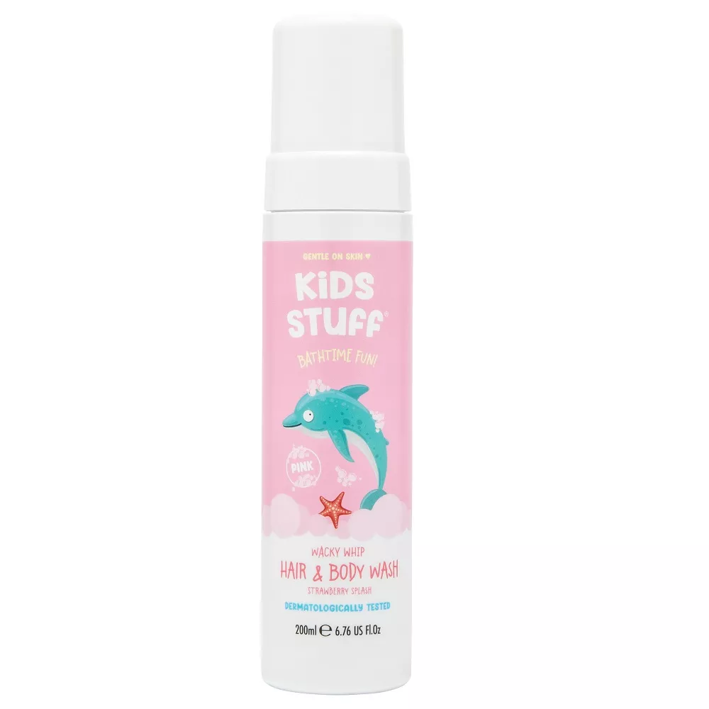 Kids Stuff Whacky Whip Hair & Body Wash to pianka do mycia ciała i włosów, która zmienia codzienną kąpiel dziecka w zabawne przeżycie. Ta delikatna dla skóry i testowana dermatologicznie pianka o truskawkowym zapachu, wyróżnia się swoim różowym kolorem, który z pewnością zachwyci każde dziecko. Kids Stuff to firma rodzinna, która doskonale rozumie, jak sprawić, by kąpiel była przyjemnością zarówno dla dzieci, jak i dla rodziców.