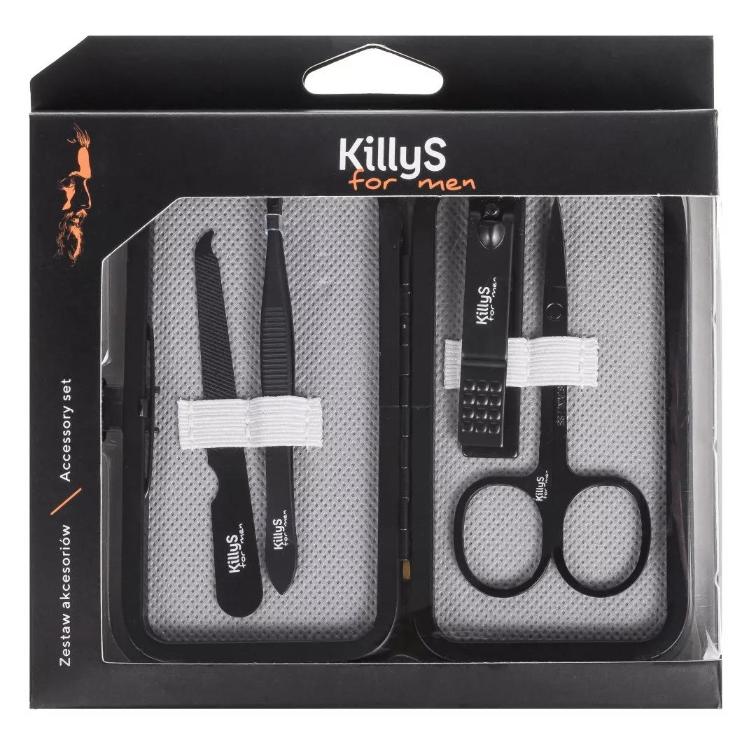 Zestaw akcesoriów kosmetycznych KillyS For Men Accessory Set to idealne rozwiązanie dla mężczyzn dbających o swoje paznokcie. Zawiera 5 trwałych narzędzi wykonanych z wysokiej jakości stali nierdzewnej, zamkniętych w stylowym etui. Doskonale sprawdzi się zarówno podczas pielęgnacji w domu, jak i w podróży.