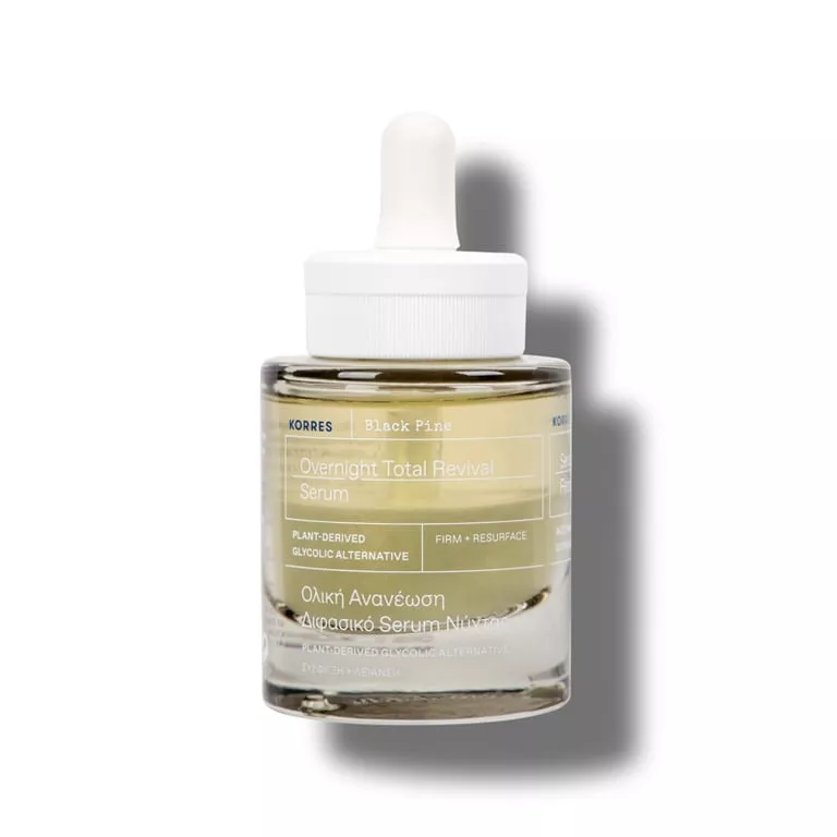 Odkryj moc nocnej regeneracji z Korres Black Pine 4D, serum do twarzy na noc overnight total revival. To innowacyjne dwufazowe serum zawiera roślinną alternatywę dla kwasu glikolowego, która działa, gdy Ty śpisz, odnawiając powierzchnię skóry, wygładzając jej teksturę i ujędrniając jej wygląd. Idealne do walki z oznakami starzenia, to serum zapewnia widoczne rezultaty już po jednej nocy.