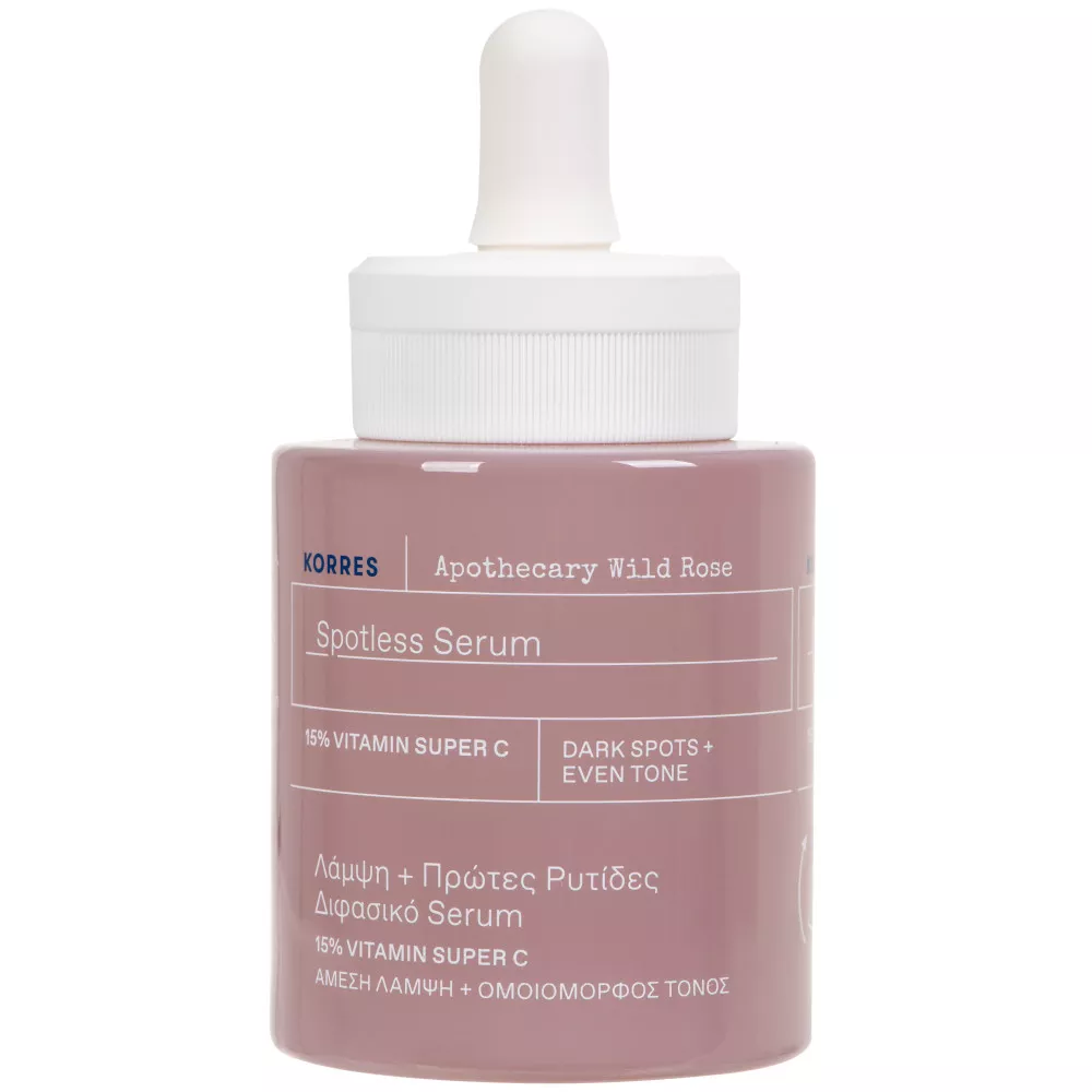 Dwufazowe serum do twarzy Korres Apothecary Wild Rose z witaminą C to idealne rozwiązanie dla skóry wymagającej rozjaśnienia i wyrównania kolorytu. Dzięki zawartości 15% witaminy C i 10% olejku z dzikiej róży, serum skutecznie zmniejsza widoczność przebarwień, pierwszych zmarszczek oraz oznak zmęczenia, nadając skórze zdrowy blask i gładkość.