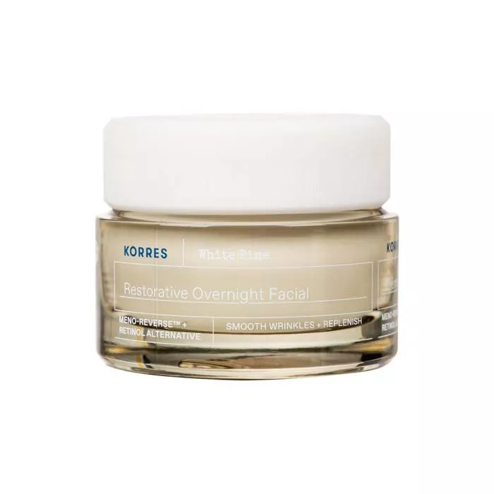Korres White Pine Restorative Overnight Facial Cream to naprawczy krem na noc stworzony z myślą o szczególnych potrzebach skóry po menopauzie. Ten zaawansowany kosmetyk wykorzystuje technologię Meno-Reverse™ oraz wyciąg z białej sosny, oferując roślinną alternatywę dla retinolu. Krem skutecznie zmniejsza widoczność głębokich zmarszczek, ujędrnia skórę i intensywnie ją nawilża, zapewniając komfort nawet najbardziej delikatnej i wrażliwej skórze.