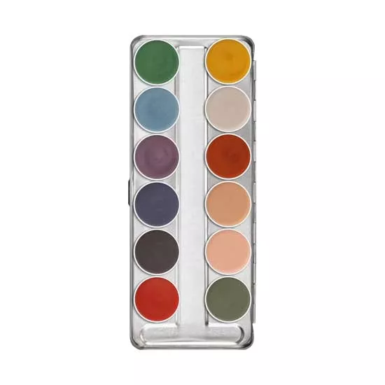 Paleta zawiera 12 różnych farb do twarzy i ciała, zamkniętych w praktycznym, trwałym etui.