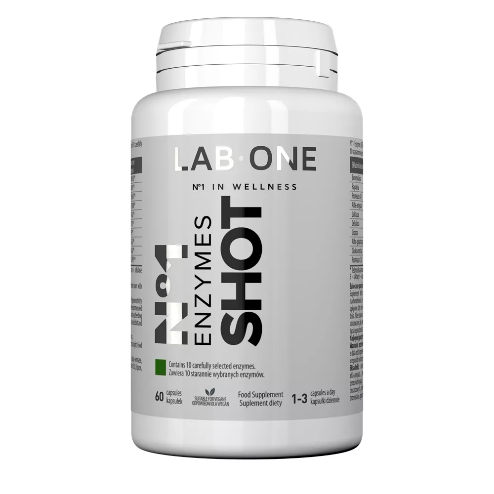 LAB ONE N°1 Enzymes Shot to suplement diety w kapsułkach, który wspomaga trawienie dzięki zawartości 10 specjalnie dobranych enzymów. Enzymy te pełnią rolę katalizatorów reakcji chemicznych w organizmie, wspierając optymalne funkcjonowanie układu pokarmowego. Produkt jest szczególnie polecany osobom dbającym o zdrowie trawienne i odpowiedni dla wegan.