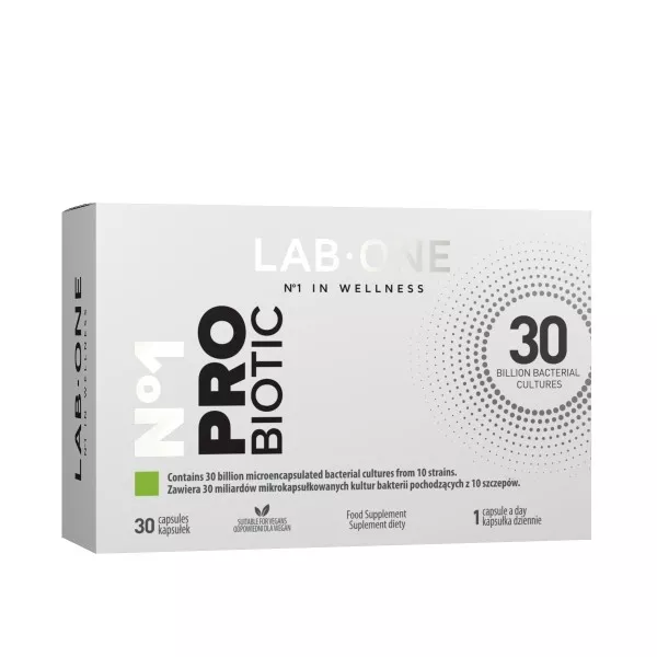 LAB ONE N°1 ProBiotic to zaawansowany suplement diety, który wspiera zdrową mikroflorę bakteryjną jelit. Każda kapsułka dostarcza aż 30 miliardów żywych kultur bakterii z 10 różnych szczepów. Dodatkowo, suplement wzbogacony jest o błonnik akacjowy, a jego specjalna technologia mikrokapsułkowania zapewnia maksymalną ochronę bakterii.