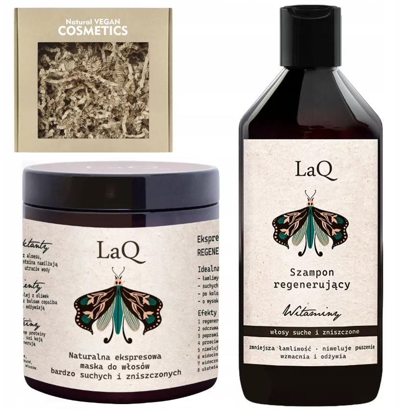 LaQ Botanic Hair to zestaw regenerujący, który składa się z szamponu o pojemności 300 ml oraz maski do włosów 250 ml. To doskonałe rozwiązanie dla osób z włosami łamliwymi, matowymi, szorstkimi, po koloryzacji, rozjaśnianiu lub o wysokiej porowatości. Dzięki temu zestawowi zauważalnie zmniejszysz łamliwość włosów i zniwelujesz ich puszenie. Dodatkowo, zapewnisz swoim włosom odpowiednie nawilżenie bez obciążenia, unikając efektu nieestetycznego "przyklapu".