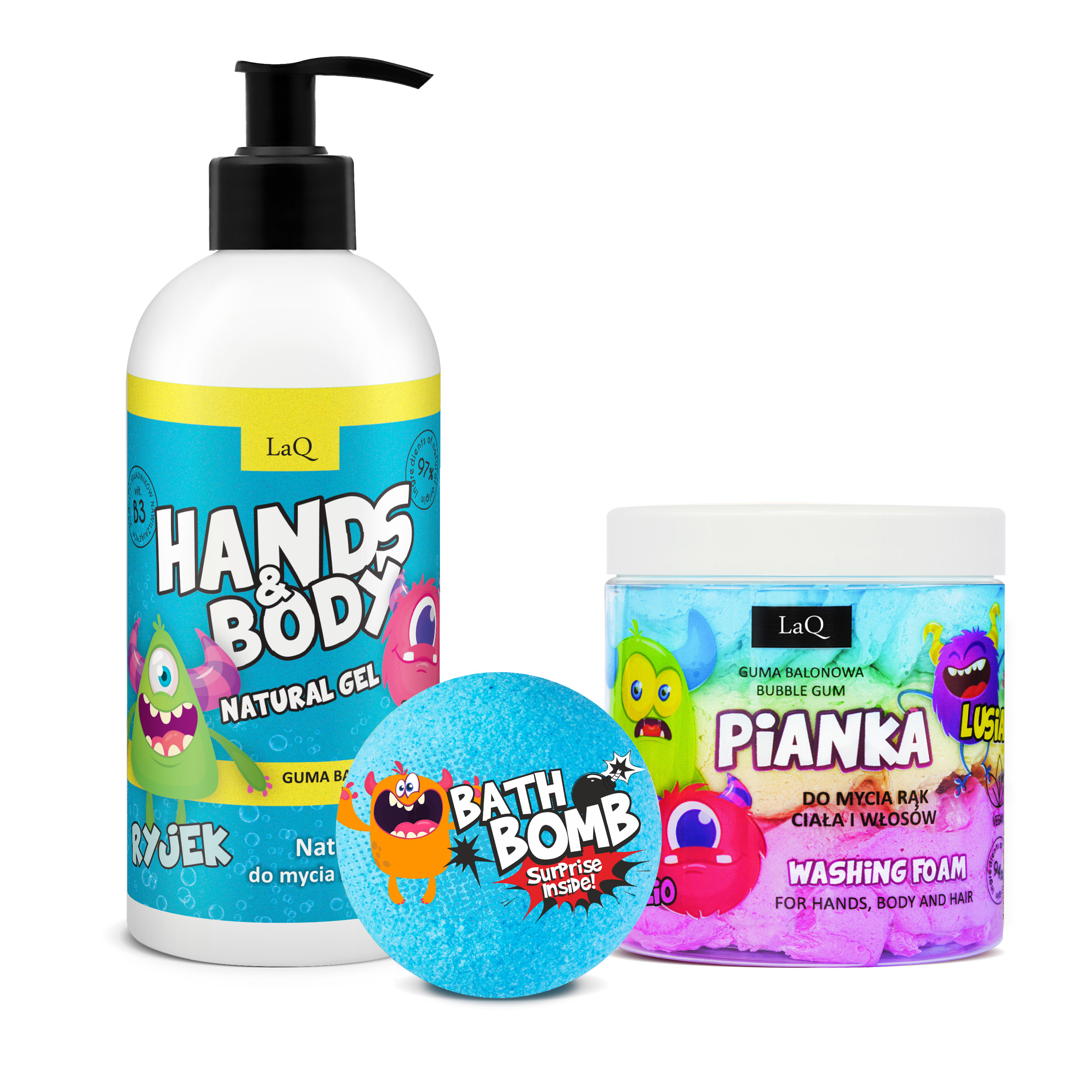 3 produkty w zestawie: żel do mycia ciała, włosów i rąk (300 ml), pianka do kąpieli w 3 kolorach (100 g) oraz musująca kula kąpielowa z niespodzianką (120 g).