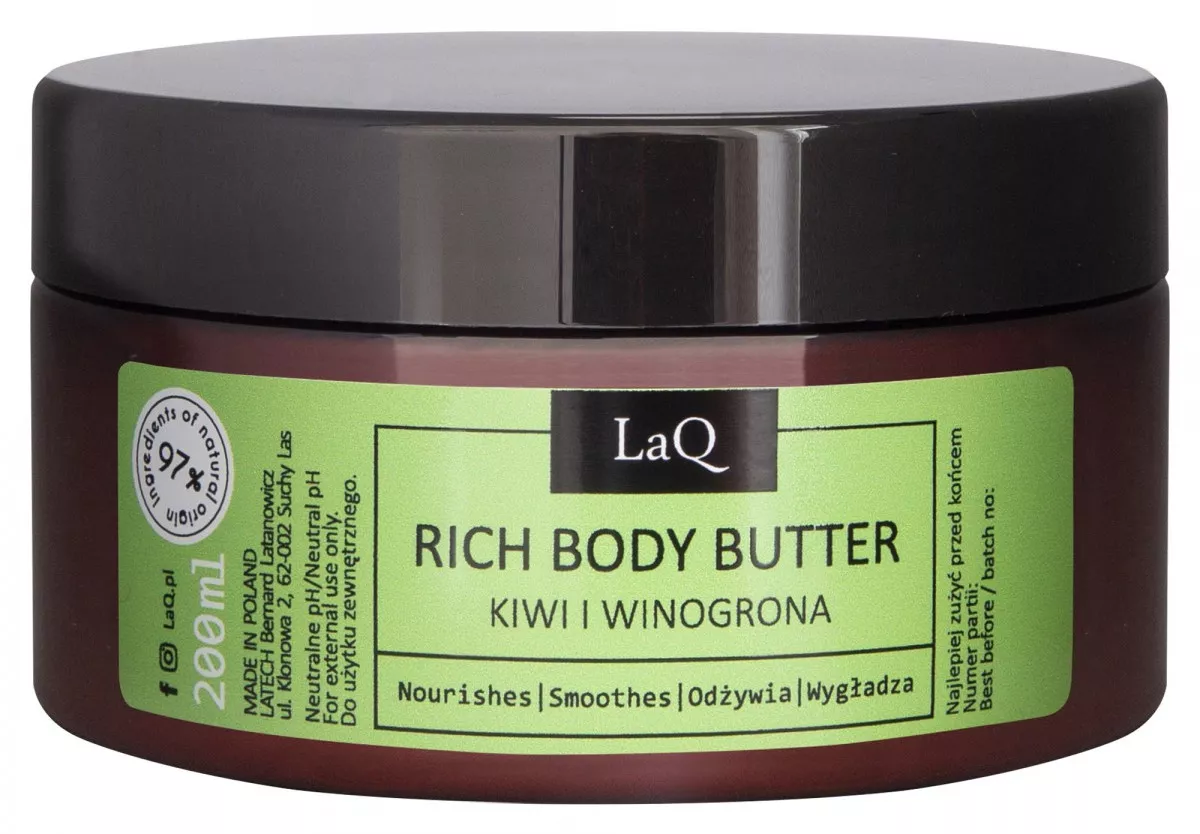 LaQ Króliczka to luksusowe masło do ciała o zapachu kiwi i winogron, które zregeneruje, odżywi i nawilży Twoją skórę. Dzięki bogatej formule zawierającej kompleks olejów, pantenol, niacynamid oraz balsam Copaiba, produkt skutecznie koi skórę, przywraca jej elastyczność i wspomaga ochronę przed działaniem czynników zewnętrznych.