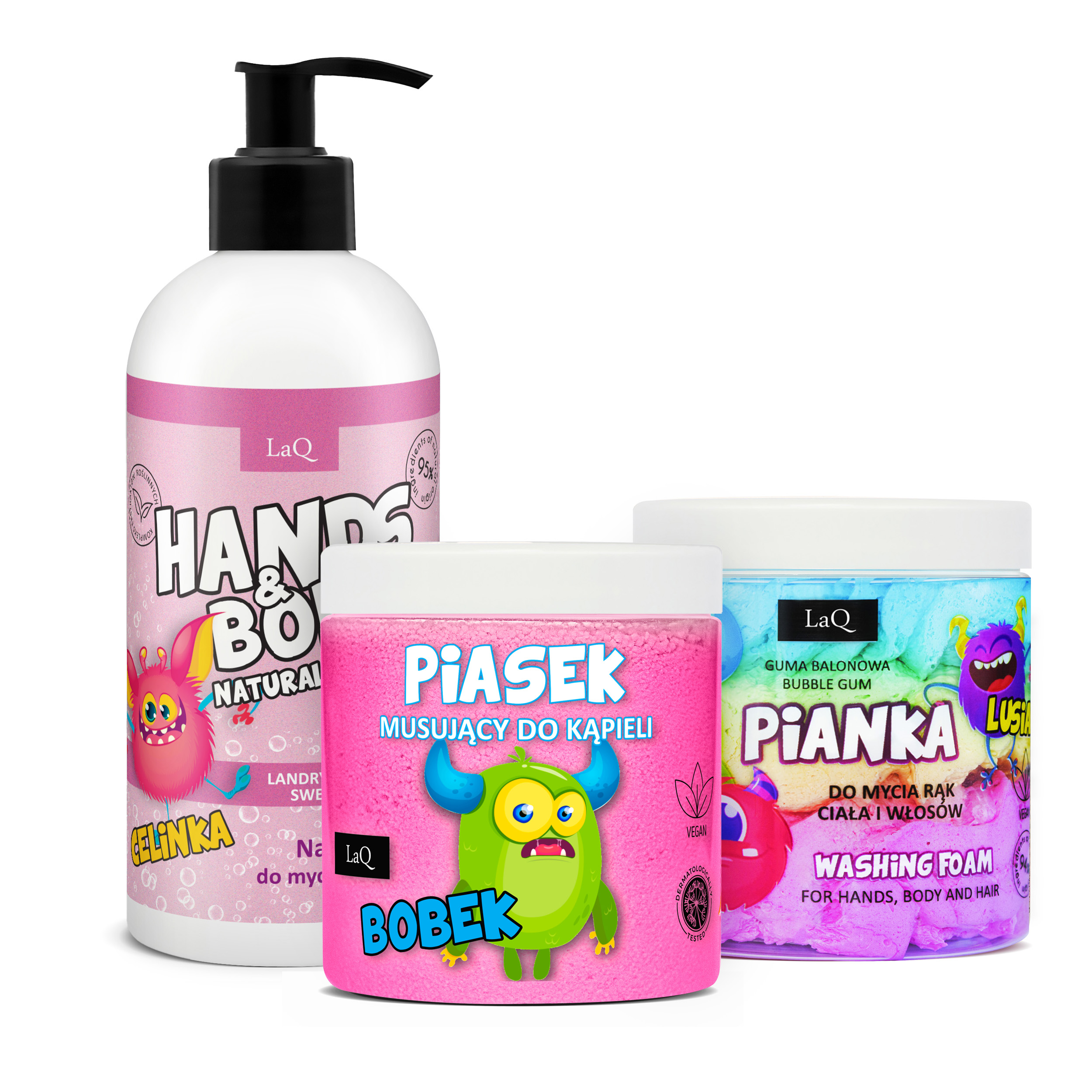 LaQ Landryna, zestaw do ciała dla dzieci to wyjątkowy prezent, który zamieni każdą kąpiel w radosną, pachnącą przygodę! W zestawie znajdziesz naturalny żel do mycia ciała i rąk 300 ml, musujący piasek do kąpieli 190 g oraz różową piankę do łapek 20 g. Produkty wyróżniają się wegańską formułą, naturalnymi składnikami oraz energetyzującymi, dziecięcymi zapachami landrynek, gumy balonowej i soczystej wiśni. Całość zapakowana jest w efektowny kartonik z okienkiem, wypełniony siankiem, dlatego idealnie nadaje się na prezent dla dziecka z okazji urodzin, Dnia Dziecka czy świąt.