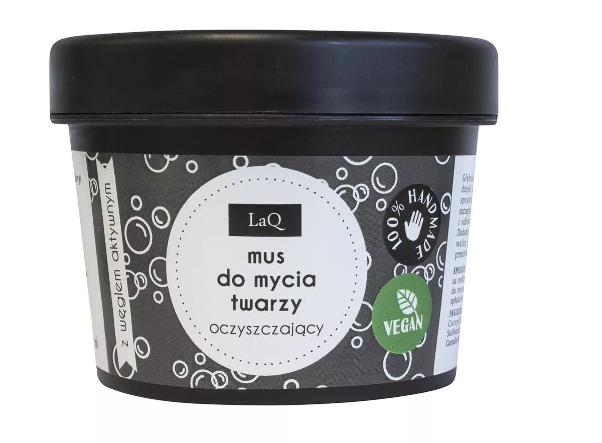 Chcesz, żeby Twoja cera była gładka, wyglądała świeżo i promiennie? W takim razie zafunduj jej dogłębne oczyszczanie. W sposób delikatny i przyjemny zrobisz to z oczyszczającym musem do mycia twarzy LaQ. Kosmetyk o lekkiej, przyjemnej formule przy kontakcie z wodą i skórą zaczyna się pienić. Zawiera węgiel aktywny, który jest odpowiedzialny za regulowanie pracy gruczołów łojowych. Z kolei olej z nasion konopi siewnych działa przeciwzapalnie oraz detoksykująco. Mus sprawia, że codziennie znikają kolejne niedoskonałości, a skóra zaczyna wyglądać nieskazitelnie. Takie głębokie oczyszczanie pod znakiem naturalnych składników to coś, czego Twoja skóra potrzebuje. Mus jest wykonywany ręcznie. To kosmetyk wegański, co oznacza, że nie zawiera składników pochodzenia zwierzęcego i nie był testowany na zwierzętach. Co istotne, mus nie zaburza naturalnego pH skóry, więc nie narusza jej naturalnej bariery ochronnej.