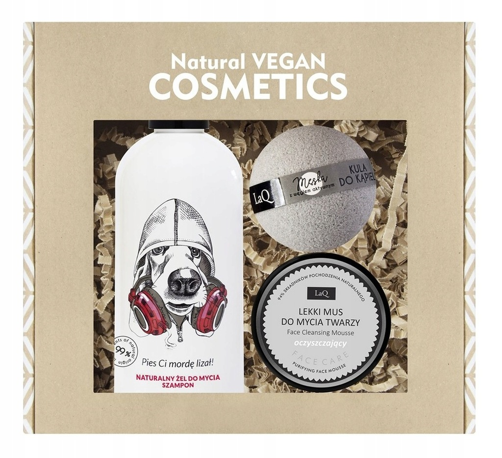 Zestaw LaQ Music "Ogarnij się Pies" to doskonała propozycja dla mężczyzn i nastolatków poszukujących naturalnej pielęgnacji w duchu wegańskim. W eleganckim, prezentowym pudełku z okienkiem i dekoracyjnym siankiem znajdziesz trzy wyjątkowe produkty: żel i szampon 2w1 do mycia ciała oraz włosów (300 ml), oczyszczający mus do mycia twarzy (40 g) oraz musującą męską kulę do kąpieli (120 g). Ten kompleksowy zestaw skutecznie oczyszcza, pielęgnuje i relaksuje, a wyjątkowe kompozycje zapachowe zapewniają prawdziwą przyjemność podczas codziennych rytuałów.