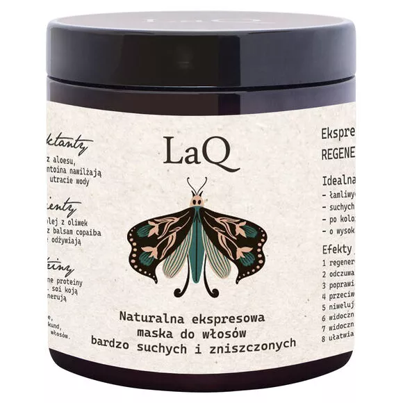 LaQ przedstawia regenerująco-odżywczą ekspresową maskę do włosów 8w1, która łączy w sobie moc protein, emolientów i humektantów. Ta maska jest idealnym rozwiązaniem dla włosów łamliwych, matowych, szorstkich, suchych, bardzo suchych oraz zniszczonych, a także dla włosów poddawanych koloryzacji i rozjaśnianiu, charakteryzujących się wysoką porowatością.