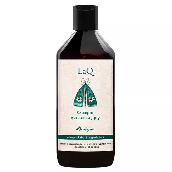 Wzmacniający szampon z biotyną marki LaQ to doskonałe rozwiązanie dla osób z osłabionymi włosami. Dzięki zawartości biotyny przyspiesza wzrost zdrowych włosów i skutecznie redukuje ich wypadanie. Regularne stosowanie sprawia, że włosy stają się mocniejsze, mniej łamliwe i zyskują dodatkową objętość. Szampon posiada właściwości odżywcze i nawilżające, a jego formuła jest całkowicie wegańska i naturalna, z pH neutralnym dla skóry głowy.