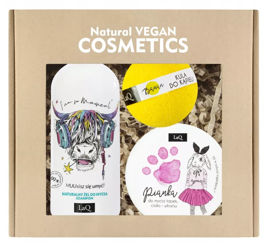 Odkryj magiczny świat kąpieli z zestawem kosmetyków LaQ Music. Ten unikalny zestaw zawiera żel Krowa 300ml, różową piankę do łapek 50ml oraz musującą kulę do kąpieli o zapachu banana 120g. Zainspirowany dziecięcą radością i zapachem gumy balonowej, ten zestaw jest idealny nie tylko dla najmłodszych, ale także dla dorosłych, którzy chcą wrócić do beztroskich chwil dzieciństwa.