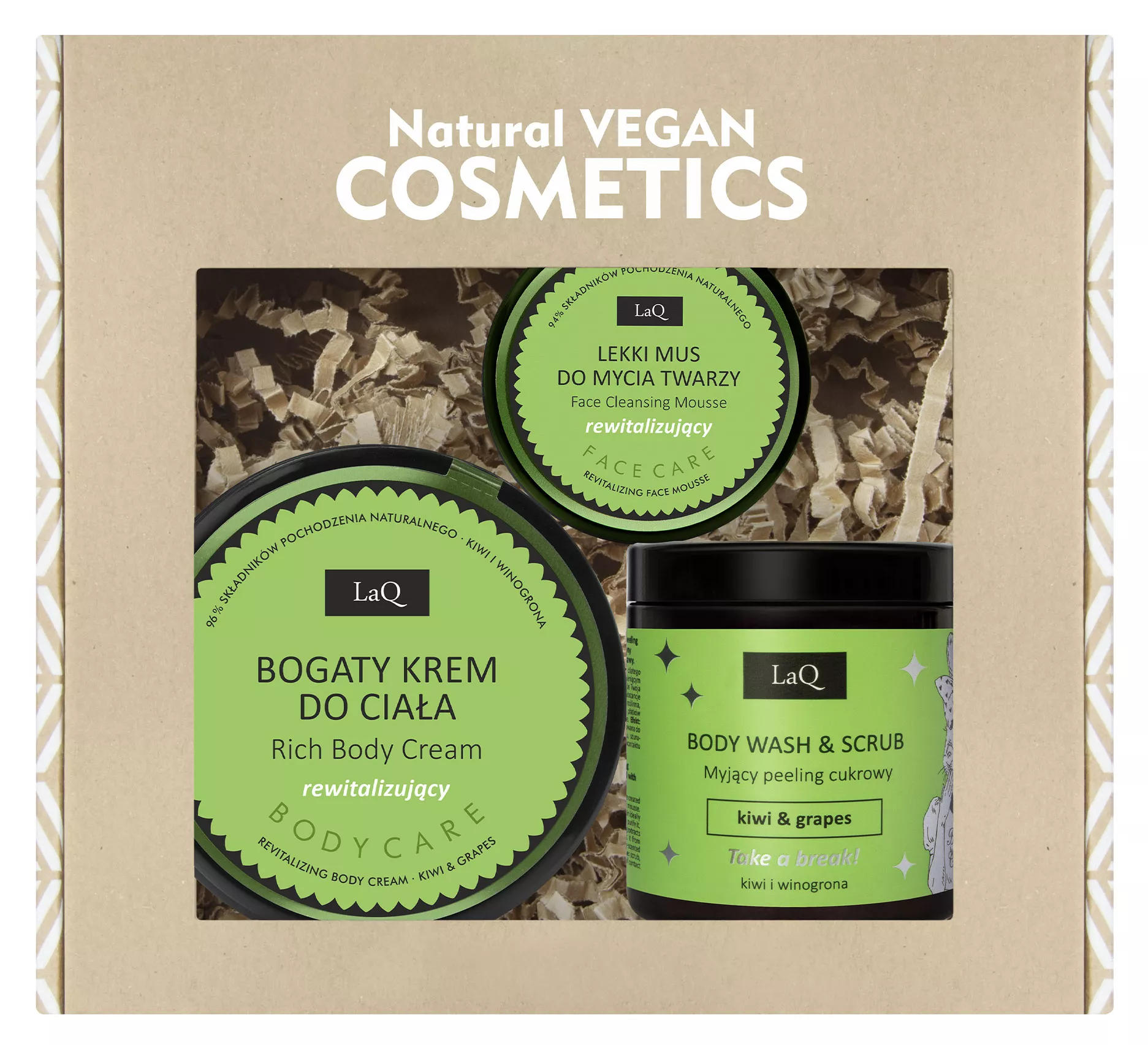 Odkryj niezrównaną pielęgnację dzięki zestawowi LaQ Kiwi i Winogrona, który łączy w sobie trzy wyjątkowe produkty: scrub, krem do ciała i mus do mycia twarzy. Ten zestaw oferuje kompleksową pielęgnację, pozostawiając skórę nawilżoną, odżywioną i pełną blasku.