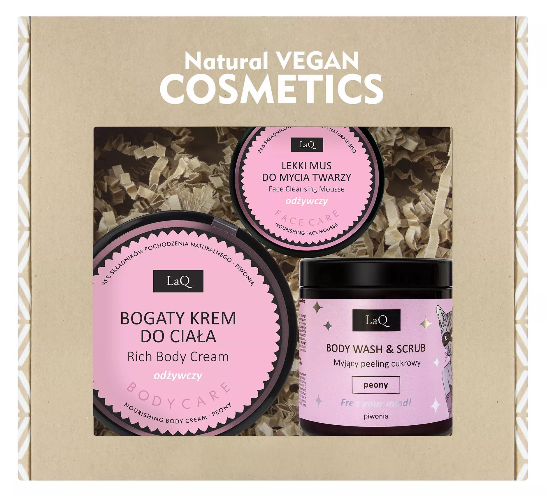Kultowa seria LaQ o sensualnym zapachu ekskluzywnych perfum, który odzwierciedla wszystkie oblicza kobiecej natury: zmysłowość, dzikość, tajemniczość, seksapil i elegancję. Zestaw Piwonia został stworzony dla kobiet takich jak nasza Kocica: silnych, zdecydowanych i pewnych swojej wartości. W skład zestawu wchodzą: peeling myjący, bogaty krem do ciała oraz mus do mycia twarzy.