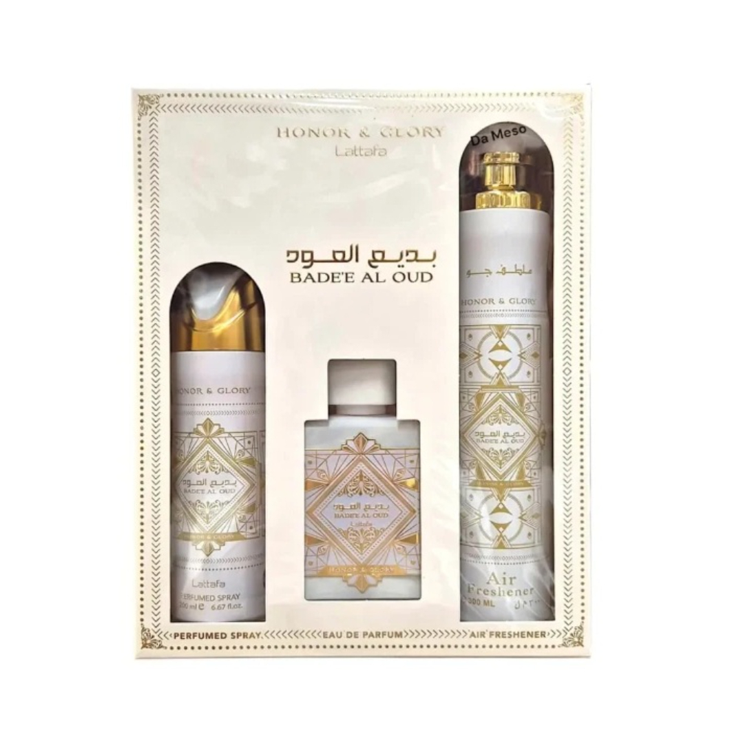 Zestaw Lattafa Bade'e Al Oud Honor & Glory to wyjątkowa propozycja dla osób ceniących luksus i wyrafinowanie. Składa się z wody perfumowanej o pojemności 100ml, dezodorantu w sprayu 200ml oraz odświeżacza powietrza 300ml, co czyni go idealnym wyborem dla tych, którzy chcą otaczać się eleganckim zapachem na co dzień.