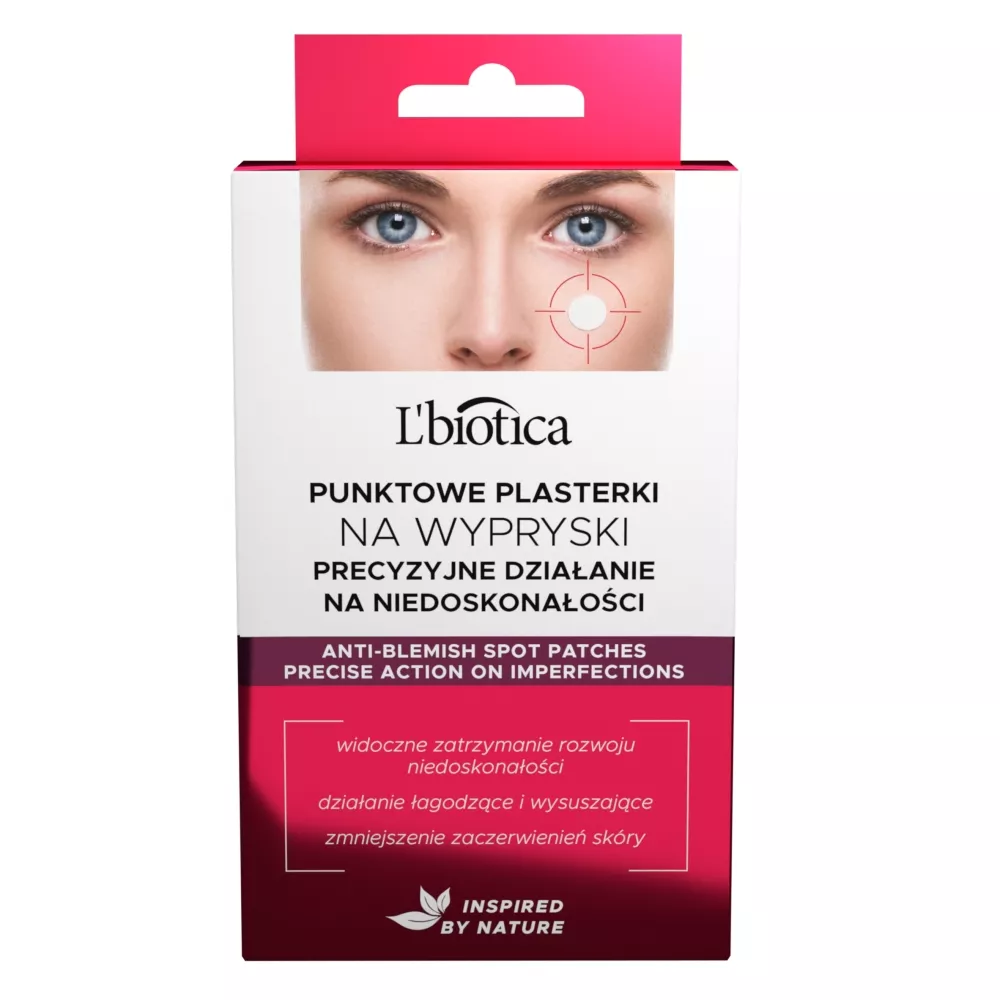 L'biotica Punktowe plasterki na wypryski to prosty i szybki sposób na czystą, zdrową cerę. Przezroczyste plasterki o antybakteryjnej formule, wzbogaconej o ekstrakt z drzewa herbacianego i wierzby kanadyjskiej, skutecznie działają wysuszająco i łagodząco na stany zapalne skóry, wyraźnie poprawiając jej wygląd. Produkt jest przeznaczony do miejscowego stosowania bezpośrednio na zmiany trądzikowe, takie jak wykwity podskórne, krosty i grudki. Dzięki praktycznej aplikacji i dyskretnej formie, plasterki można stosować w ciągu dnia, co czyni je idealnym rozwiązaniem dla cery problematycznej zarówno u kobiet, jak i mężczyzn.