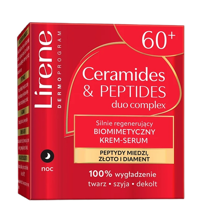 Lirene Ceramides & Peptides to silnie regenerujący, biomimetyczny krem-serum na noc przeznaczony dla skóry dojrzałej 60+. Łączy intensywne działanie przeciwzmarszczkowe oraz liftingujące z głęboką regeneracją i odbudową skóry podczas snu. Zaawansowana formuła oparta na synergii ceramidów i peptydów wspiera procesy naprawcze, wzmacnia barierę ochronną i poprawia elastyczność, jędrność oraz gęstość skóry twarzy, szyi i dekoltu.