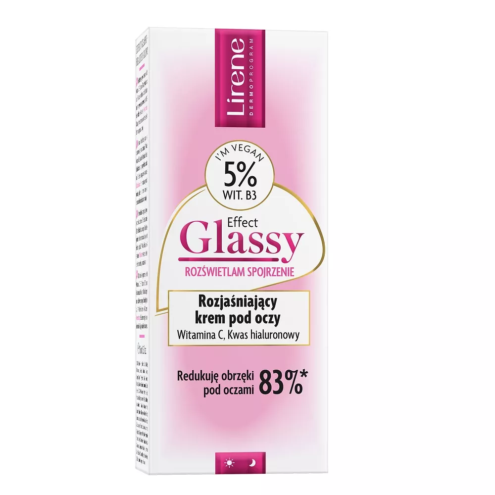 Osiągnij efekt glass skin dzięki pielęgnacji! Lirene Effect Glassy rozjaśniający krem pod oczy redukuje obrzęki i regeneruje delikatną skórę wokół oczu, wygładzając i przywracając jej promienny wygląd. Skutecznie redukuje cienie dzięki Alpha-white complex™ – pionierskiemu połączeniu rozjaśniających składników aktywnych stworzonych przez ekspertki z Laboratorium Naukowego Lirene.