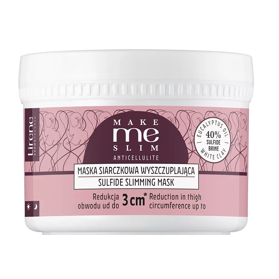 Lirene Make Me Slim Anticellulite maska siarczkowa wyszczuplająca to innowacyjny produkt do pielęgnacji ciała, który przyspiesza spalanie tkanki tłuszczowej dzięki wysokiej zawartości solanki siarczkowej (40%). Maska oferuje chwilę relaksu w domowym SPA, a jej skuteczność została potwierdzona badaniami aparaturowymi po 4 tygodniach stosowania.