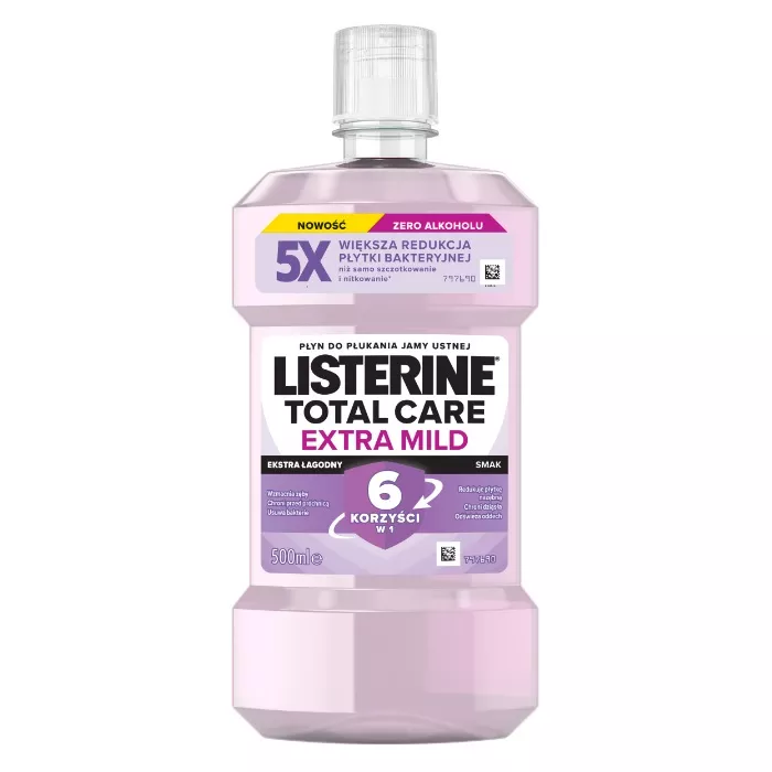 Odkryj pełne spektrum ochrony jamy ustnej z płynem do płukania Listerine Total Care Extra Mild. Dzięki regularnemu stosowaniu dwa razy dziennie, zapewnia on kompleksową ochronę i pielęgnację zębów, oferując sześć kluczowych korzyści dla zdrowia jamy ustnej. Dzięki swojej unikalnej formule, jest pięciokrotnie skuteczniejszy w redukcji płytki bakteryjnej niż samo szczotkowanie i nitkowanie.