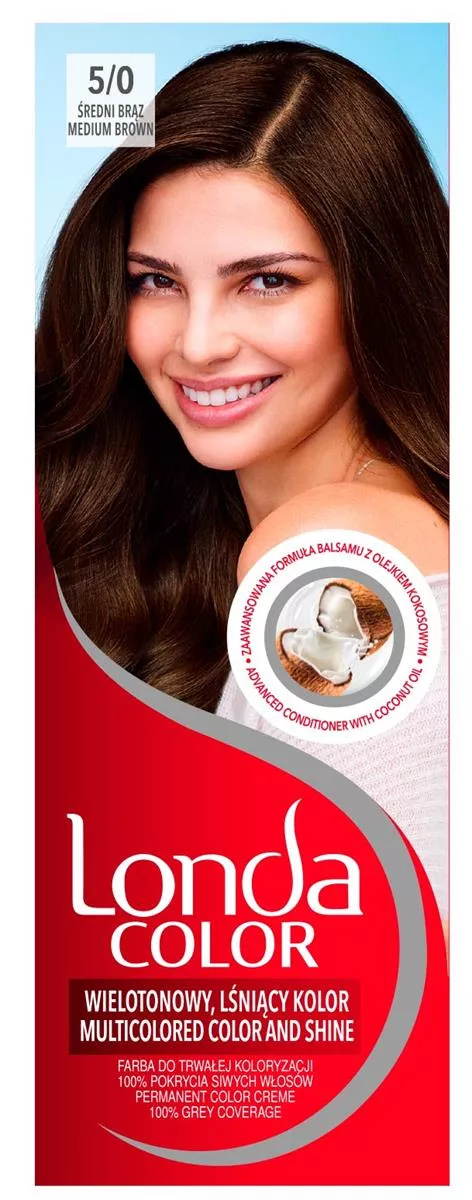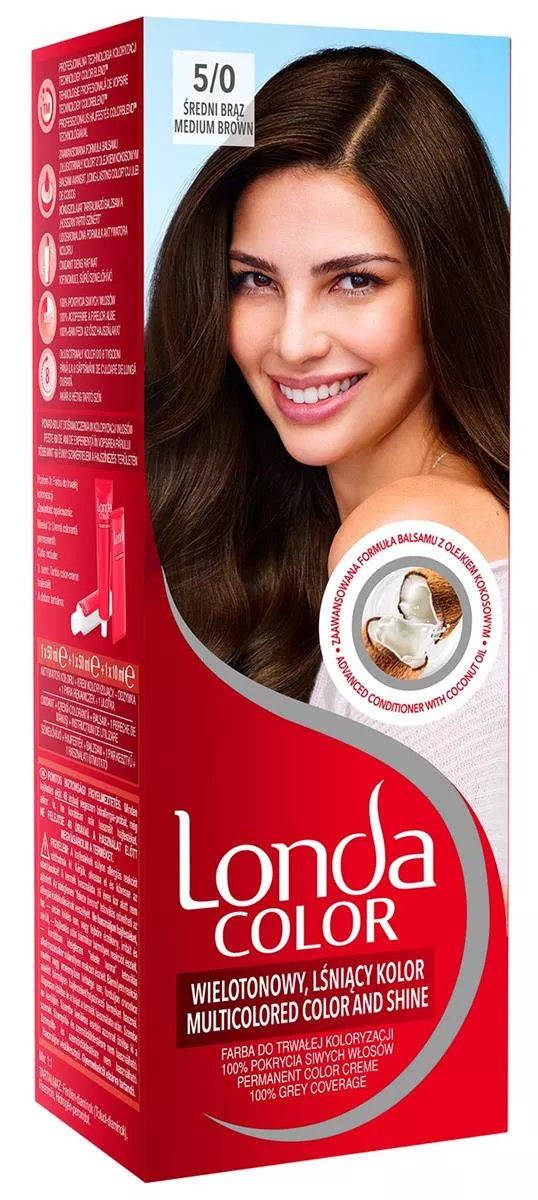 Farba do trwałej koloryzacji Londa Color. Technologia Color Blend ™to unikalna, opatentowana technologia która łączy różne, bogate w pigmenty tony jednego koloru nadając Twoim włosom wielotonowy, pełen blasku kolor. Dodatkowo zaawansowany balsam „długotrwały kolor” z olejkiem kokosowym odżywia włosy i tworzy barierę ochronną zapobiegającą wypłukiwaniu koloru. Jego ulepszona formuła zawiera aminokwas histydynę, który pozwala zneutralizować szkodliwe działanie składników chemicznych na włosy dzięki czemu włosy są lśniące, miękkie i gładkie w dotyku. Londa Color gwarantuje 100% pokrycia siwych włosów oraz długotrwały kolor aż do 8 tygodni. Opakowanie zawiera: • krem koloryzujący 50 ml, • emulsję aktywującą 50 ml, • odżywkę 10 ml, • parę rękawiczek, • instrukcję użycia.