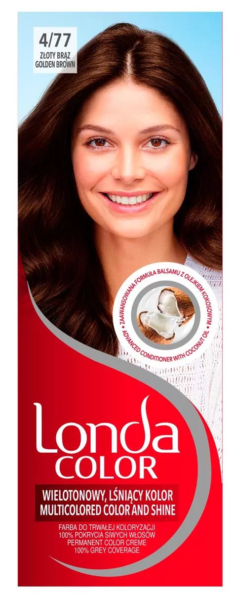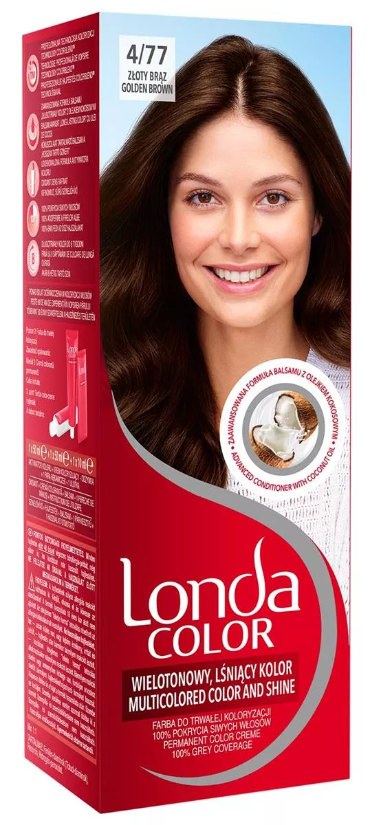 Farba do trwałej koloryzacji Londa Color. Technologia Color Blend ™to unikalna, opatentowana technologia która łączy różne, bogate w pigmenty tony jednego koloru nadając Twoim włosom wielotonowy, pełen blasku kolor. Dodatkowo zaawansowany balsam „długotrwały kolor” z olejkiem kokosowym odżywia włosy i tworzy barierę ochronną zapobiegającą wypłukiwaniu koloru. Jego ulepszona formuła zawiera aminokwas histydynę, który pozwala zneutralizować szkodliwe działanie składników chemicznych na włosy dzięki czemu włosy są lśniące, miękkie i gładkie w dotyku. Londa Color gwarantuje 100% pokrycia siwych włosów oraz długotrwały kolor aż do 8 tygodni. Opakowanie zawiera: • krem koloryzujący 50 ml, • emulsję aktywującą 50 ml, • odżywkę 10 ml, • parę rękawiczek, • instrukcję użycia.