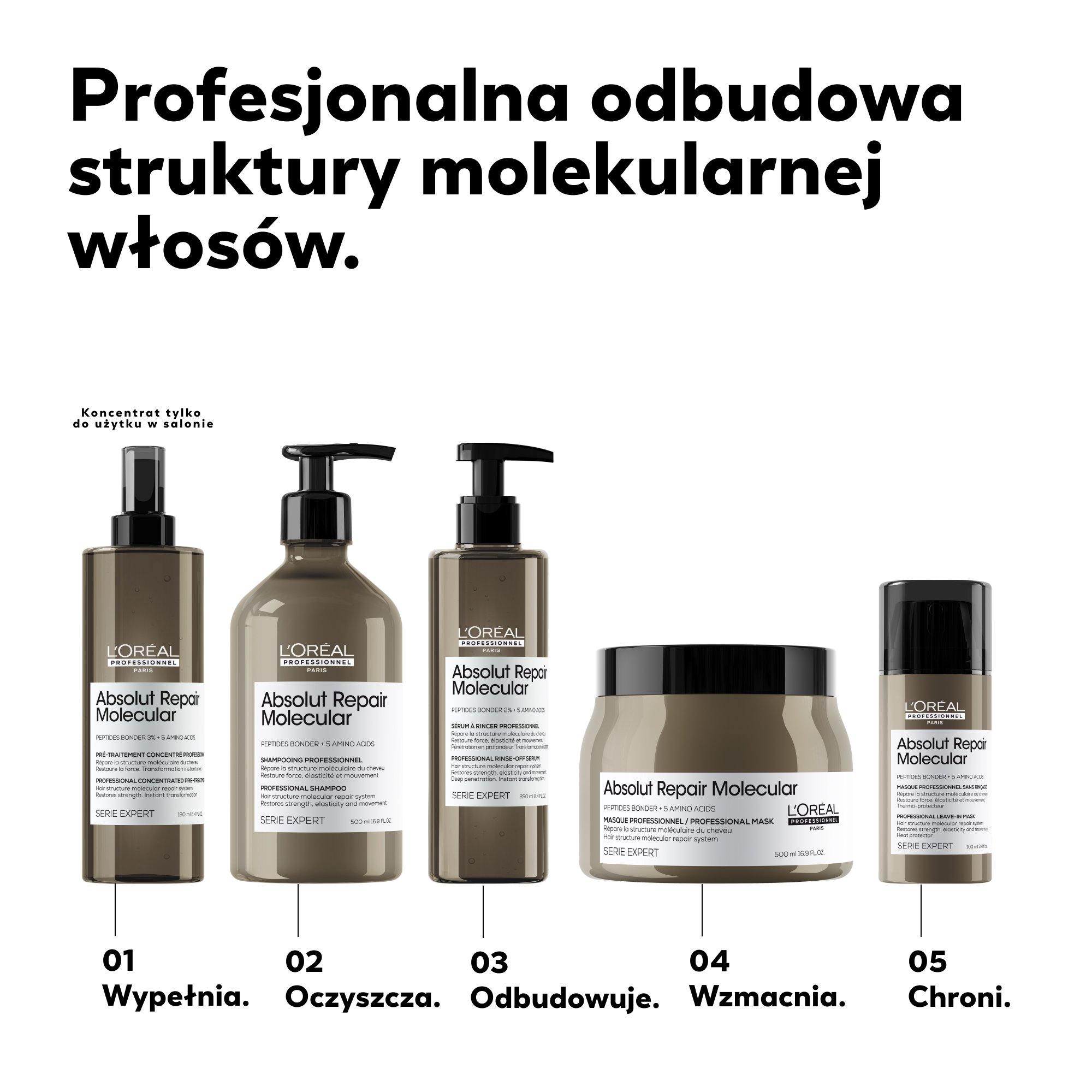 - Głęboko penetruje strukturę włosa, odbudowując go na poziomie molekularnym