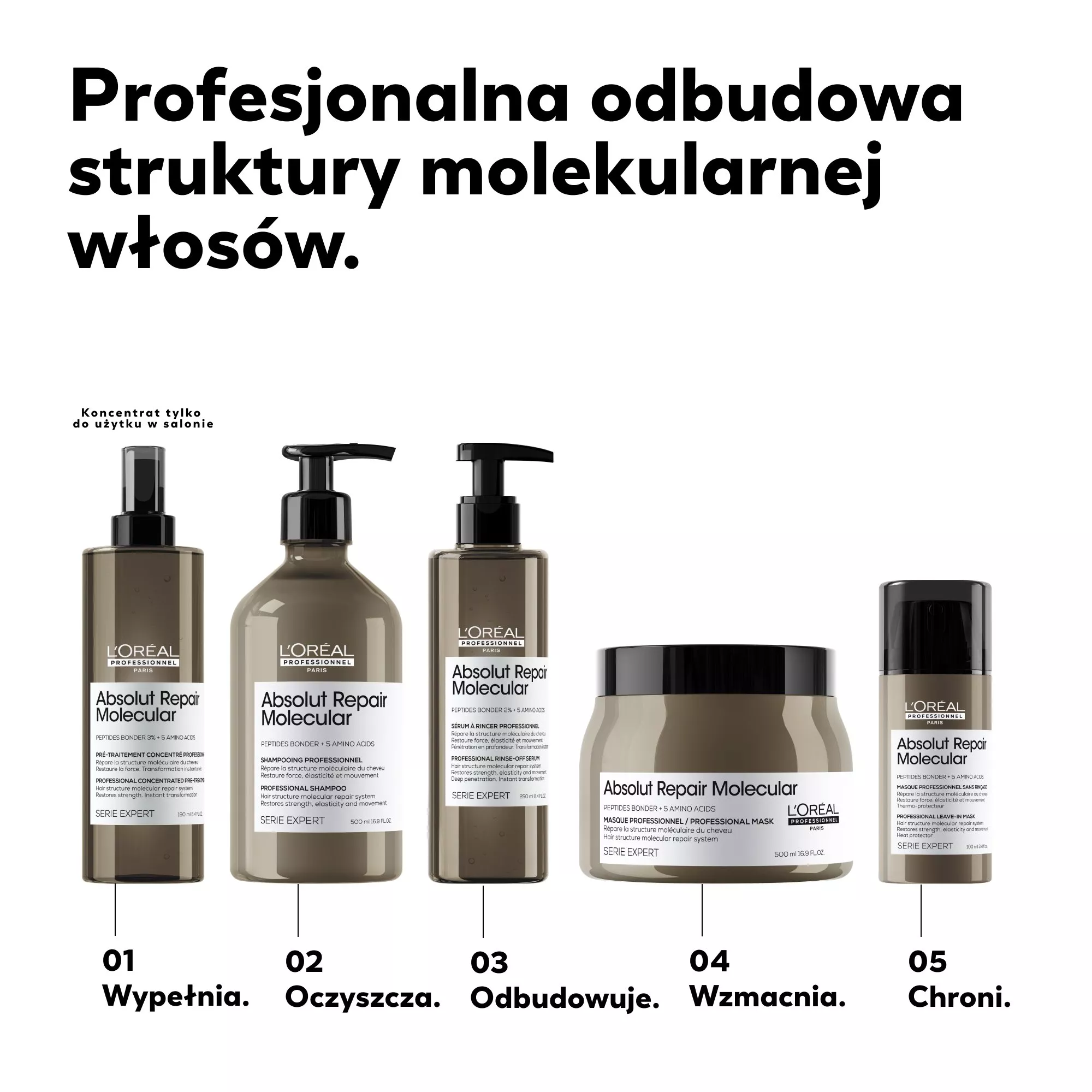 Aby osiągnąć najlepsze rezultaty, używaj maski po umyciu włosów szamponem Absolut Repair Molecular. Nałóż maskę równomiernie na osuszone ręcznikiem włosy, pozostaw na 1-2 minuty, a następnie dokładnie spłucz. W przypadku dostania się preparatu do oczu, natychmiast przepłukać je wodą.