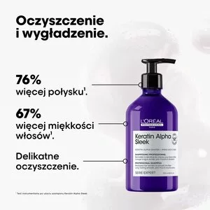 Odkryj profesjonalny szampon wygładzający Loreal Keratin Alpha Sleek stworzony z myślą o włosach puszących się i niesfornych. Zaawansowana formuła z technologią keratynową skutecznie oczyszcza, jednocześnie dbając o kondycję włosów już podczas mycia. Szampon aktywnie pielęgnuje włókno włosa, zapewniając wyraźnie więcej połysku, miękkości i wygładzenia. Efekty są widoczne już od pierwszego użycia – włosy stają się o 76% bardziej błyszczące1 i 67% bardziej miękkie1. W połączeniu z pozostałymi produktami z gamy Alpha Sleek zapewnia aż 2 tygodnie wygładzenia i widoczną kontrolę puszenia2. To fundament każdej profesjonalnej pielęgnacji dla włosów wymagających dyscypliny i intensywnego wygładzenia.