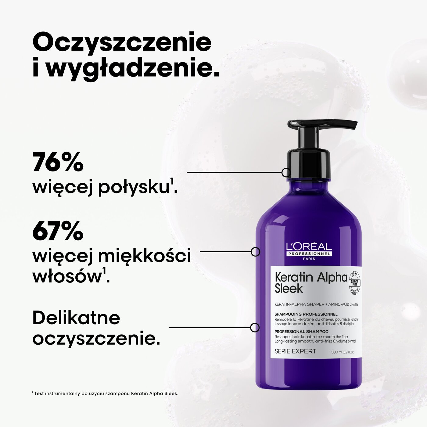 Odkryj profesjonalny szampon wygładzający Loreal Keratin Alpha Sleek, stworzony z myślą o włosach puszących się i niezdyscyplinowanych. Zaawansowana formuła z technologią keratynową delikatnie, lecz skutecznie oczyszcza włosy, jednocześnie dogłębnie je pielęgnując już podczas mycia. Szampon zapewnia intensywne wygładzenie, wyjątkowy połysk oraz kontrolę puszenia się włosów. Efekty są widoczne od pierwszego użycia – włosy stają się o 76% bardziej błyszczące1 i o 67% miększe1. Regularne stosowanie w połączeniu z innymi produktami z gamy Keratin Alpha Sleek gwarantuje nawet 2 tygodnie efektu wygładzenia i pełnej kontroli nad puszeniem2. To podstawa codziennej, profesjonalnej pielęgnacji włosów, która zapewnia widoczną transformację i dyscyplinę.