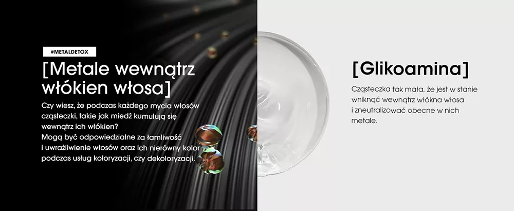 Czy wiesz, że podczas mycia może dojść do wnikania metali ciężkich z wody do włókien włosów? To z kolei skutkuje łamliwością włosów, osłabieniem i może też być jedną z przyczyn nierównego efektu podczas koloryzacji. Problem ten rozwiązuje zestaw do włosów Loreal Metal Detox. Ten zestaw zadba o włosy po koloryzacji, które mają większą skłonność do wchłaniania metali, mogą blaknąć, kruszyć się czy żółknąć. Glikoamina wnika we włókna włosów i neutralizuje skutecznie obecne w nich metale. Stosowanie kosmetyków z serii Metal Detox zmniejsza ryzyko zniszczenia włosów, zapewnia lepsze efekty koloryzacji i utrzymanie pięknego koloru na dłużej. W efekcie włosy są mięsiste, pełne blasku i zdrowe.