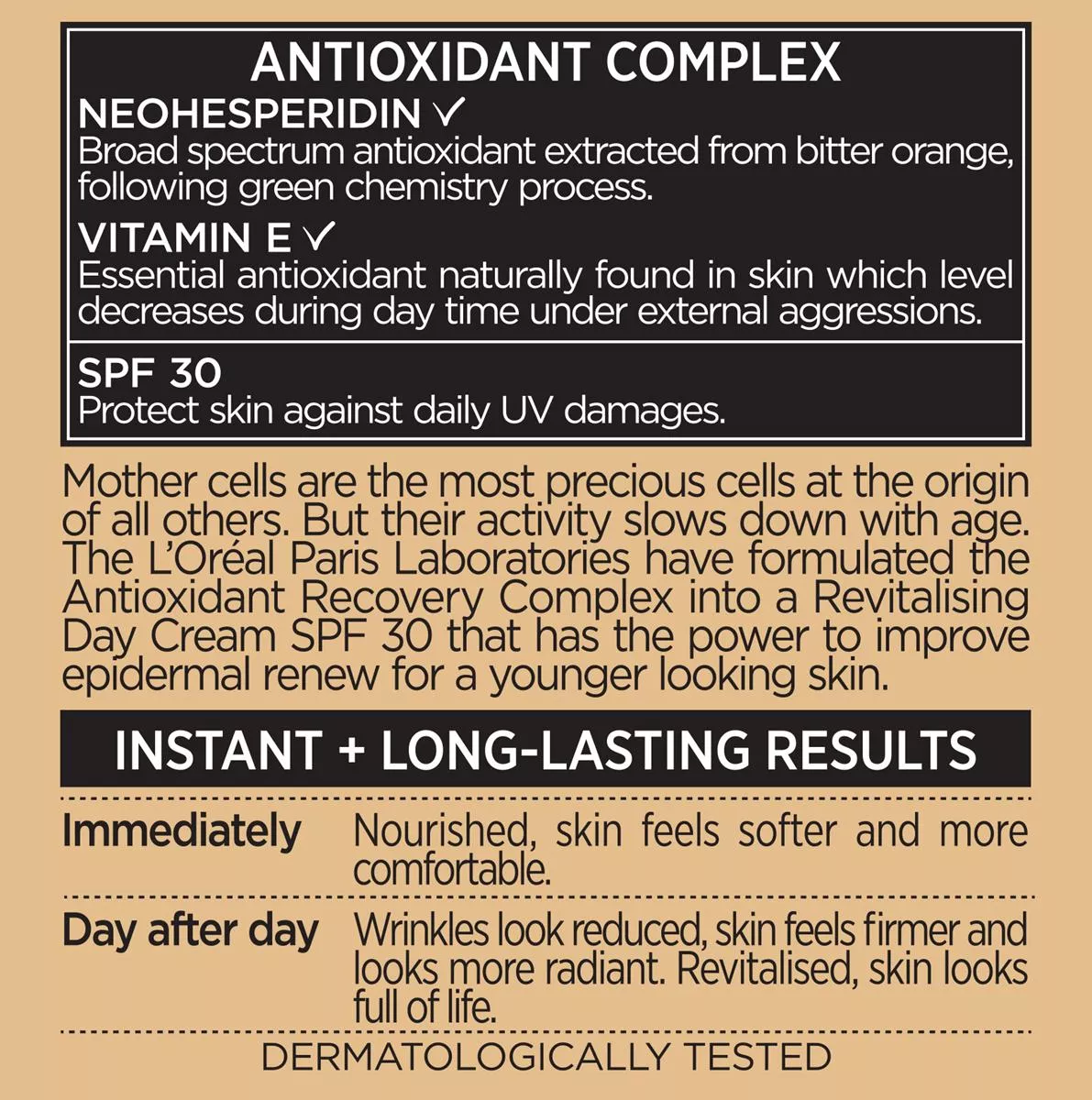- Silna regeneracja: Neohesperydyna, antyoksydant pochodzący z wyciągu z gorzkiej pomarańczy, wspomaga intensywną regenerację skóry.