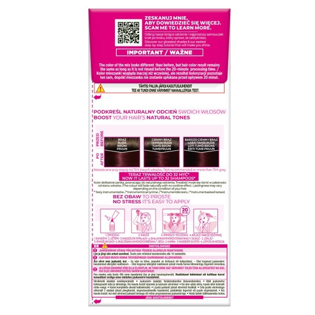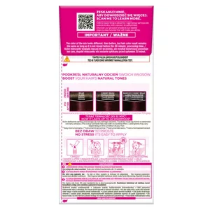 Przed użyciem zawsze przestrzegaj instrukcji zawartych w opakowaniu. Zrób test 48 godzin wcześniej, aby zapewnić bezpieczną koloryzację. Szczegółowe informacje dotyczące aplikacji znajdują się wewnątrz opakowania.
