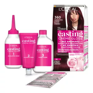 Odkryj L'Oreal Paris Casting Creme Gloss farbę do włosów w odcieniu 360 Wiśniowa Czerń. Ta szybka i łatwa w użyciu koloryzacja bez amoniaku zapewnia wyjątkowo lśniące włosy oraz optymalne pokrycie siwych włosów. Dzięki tej farbie uzyskasz 3 razy więcej blasku*, widocznie zdrowsze włosy i doskonałe pokrycie siwizny.