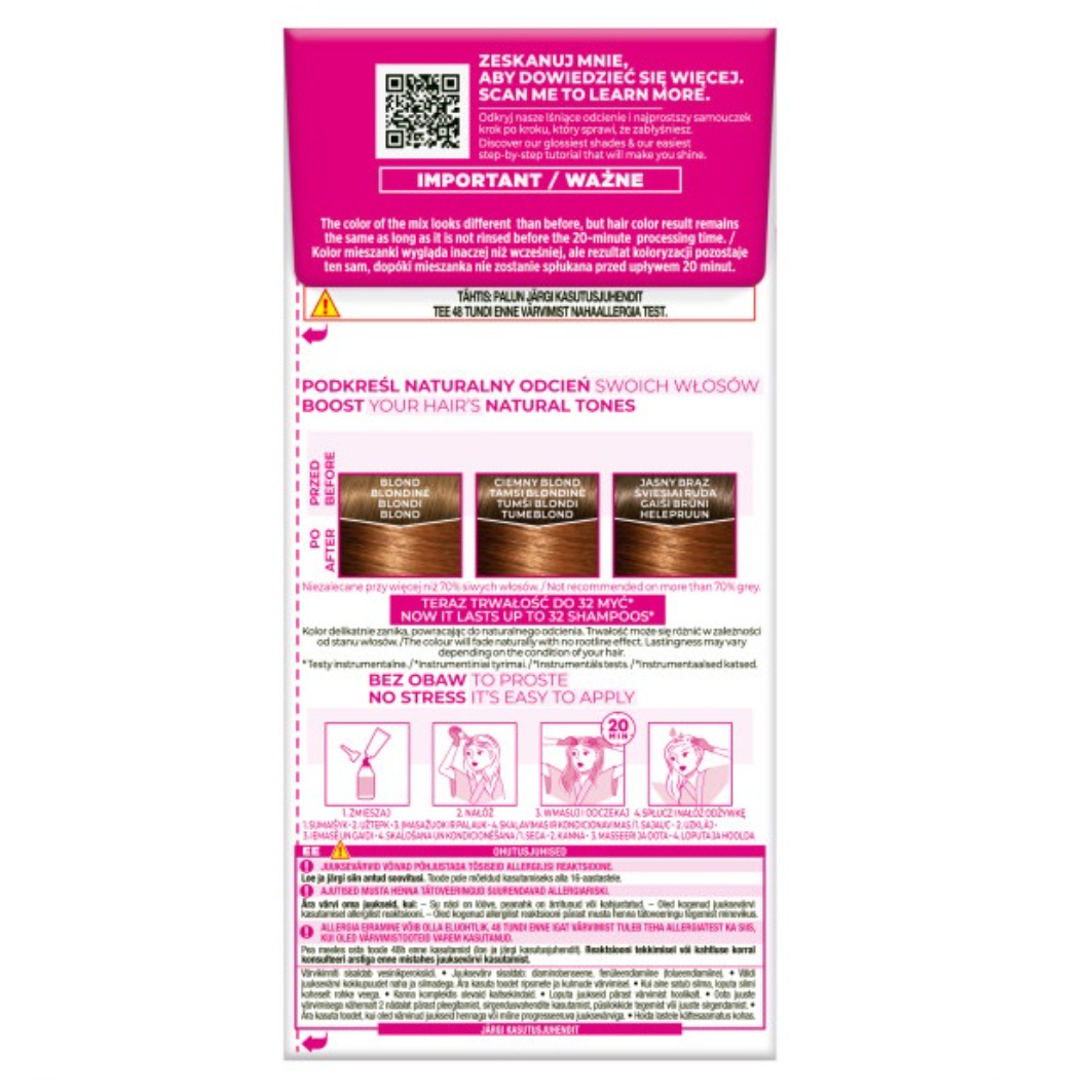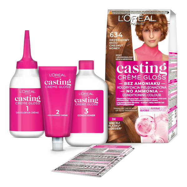 Odkryj L'Oreal Paris Casting Creme Gloss w odcieniu 634 Orzechowy Miód. Ta szybka i łatwa w użyciu farba do włosów bez amoniaku zapewnia wyjątkowy blask i optymalne pokrycie siwych włosów. Dzięki niej Twoje włosy będą 3x bardziej lśniące, widocznie zdrowsze i w pełni pokryte.