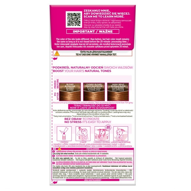 Aby uzyskać najlepsze rezultaty, należy ściśle przestrzegać instrukcji użycia. Szczegółowe informacje dotyczące aplikacji znajdują się wewnątrz opakowania. Zaleca się wykonanie testu na skórze 48 godzin przed koloryzacją, aby zapewnić bezpieczeństwo użycia.